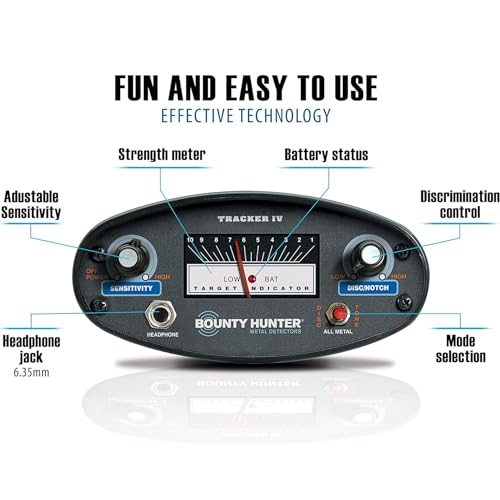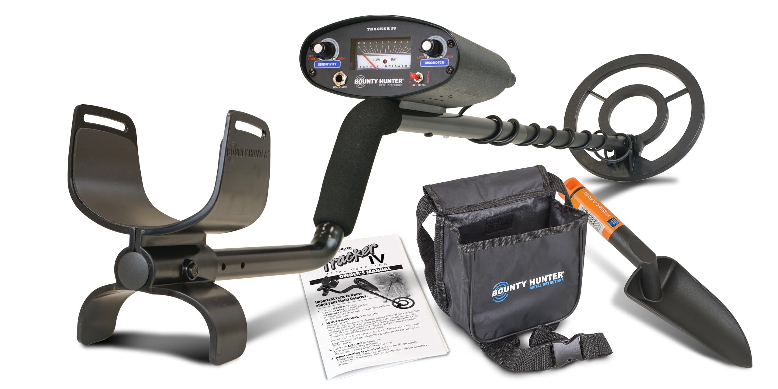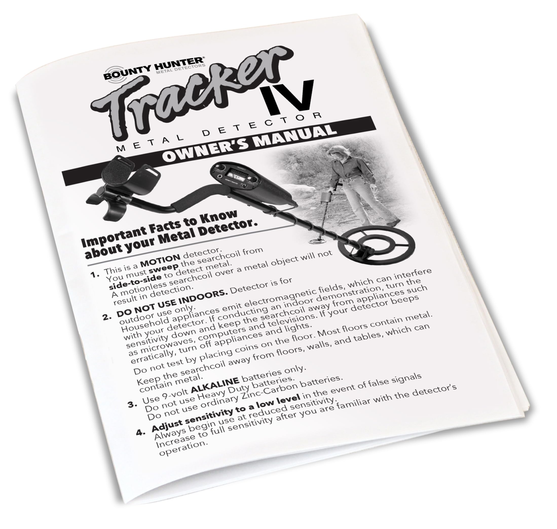 Includes metal detector, pinpointer. Detection range: 7 in. . Coil size: 8 in. . Battery size: 9 volt. Detects all kinds of metal from iron relics, coins and household items to precious metals like silver and gold. Quickly switches between Discrimination, All-Metal and Tone modes with a flick of the mode toggle. Renowned ground-balancing capability for the best results in all kinds of soil. 8 in. waterproof open face searchcoil. Target strength meter display. 2-tone audio discrimination. Built-in speaker. Length adjusts from 44 in. - 51 in. . 0. 25 in. headphone output. Padded armrest and cushioned handgrip S-Rod handle. : Five years. 45 in. L x 8 in. W x 6 in. H (13. 04 lbs. ). Bounty Hunter Tracker IV Metal Detector is a treasure hunter's dream. It's easy to operate, lightweight and extremely efficient in the field. Make treasure hunting an exciting outdoor family reality and fulfill your dreams of discovering valuable coins, antiques, relics, jewelry, silver, gold and more! You'll find buried Treasure almost everywhere you look sometimes right under your feet. Bounty Hunter Tracker IV Metal Detector detects all metals. It works through dirt, rock, wood and mud and the coil can even be submerged in water. Treasure hunting is the hobby for everyone!