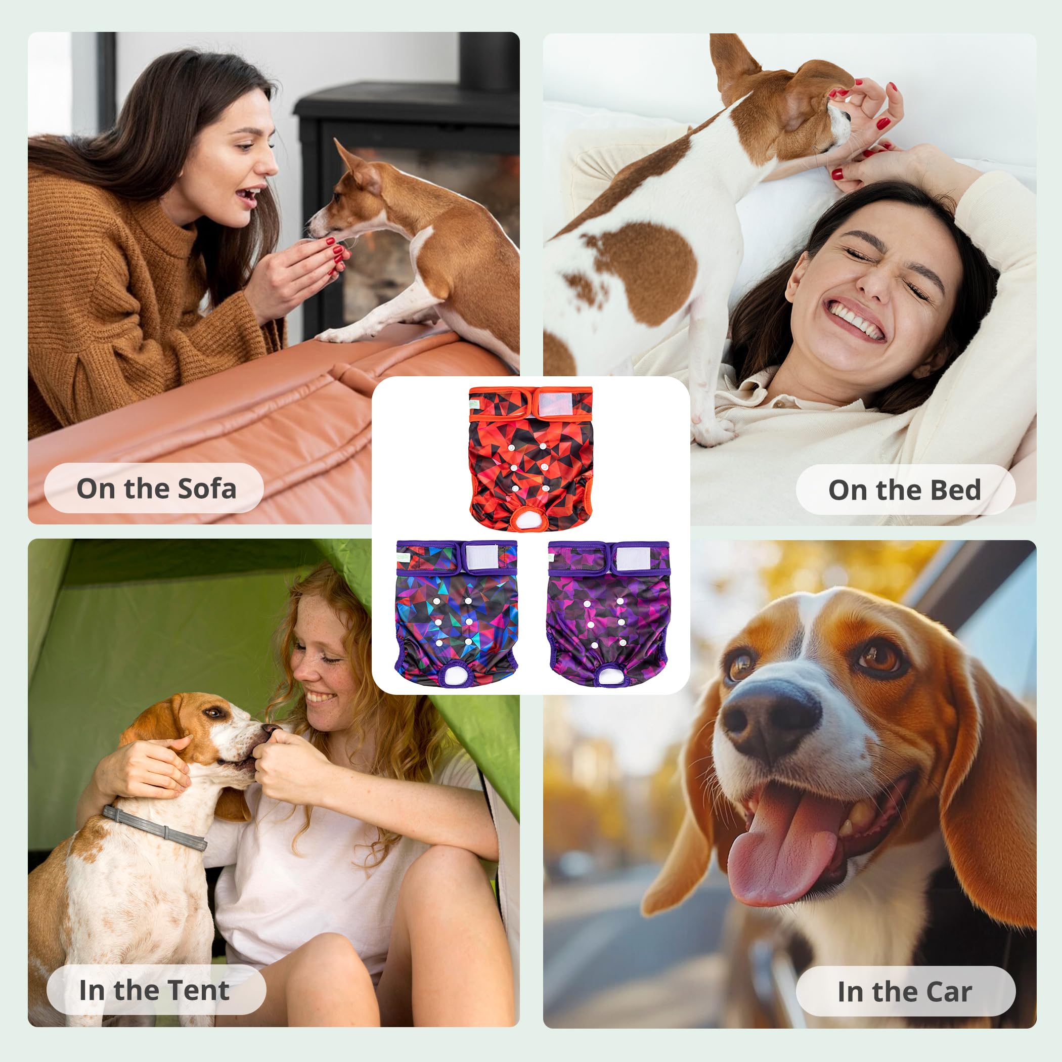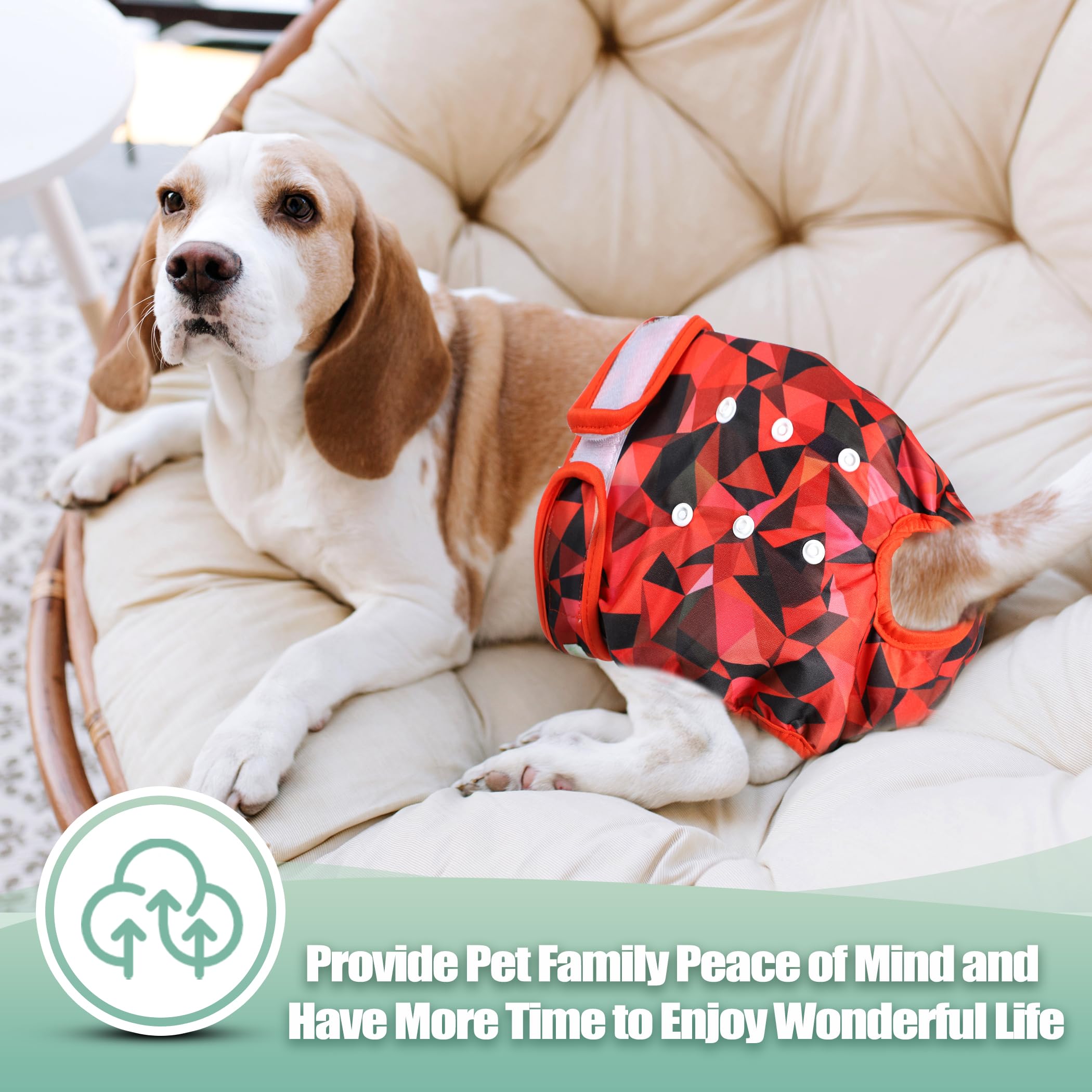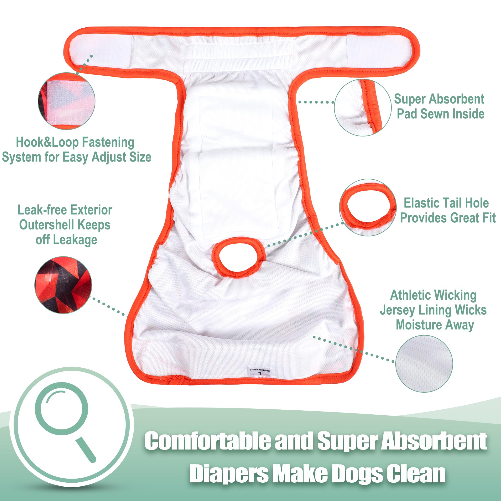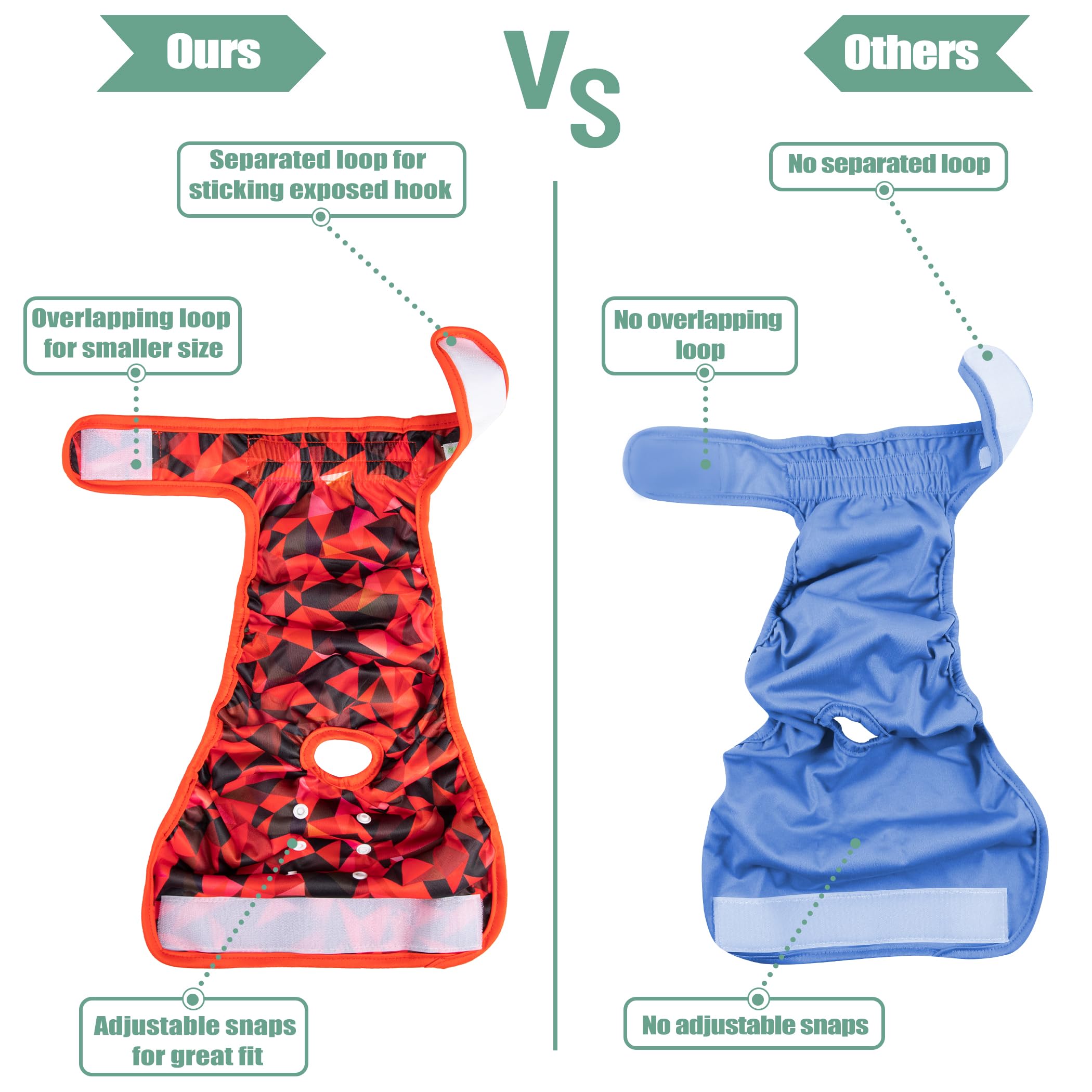 Washable dog diapers- Soft & Comfortable Diapers for Dogs - To increase your dog's comfort and acceptance our diaper wraps have no "crinkly" or uncomfortable texture that causes many dogs to dislike the ordinary disposable diapers. Hook & loop closures are quick and easy to put on and won't stick to your pet's fur.