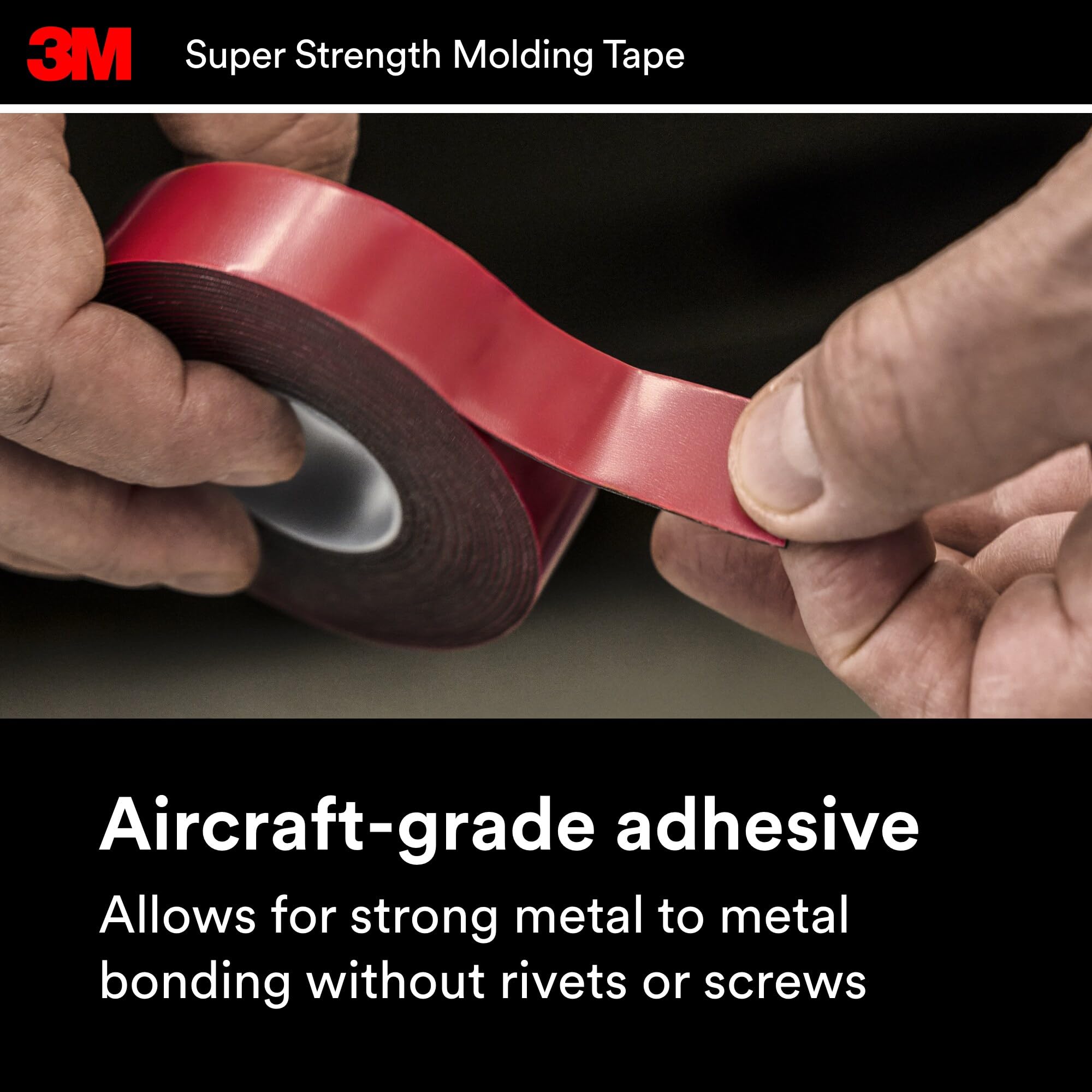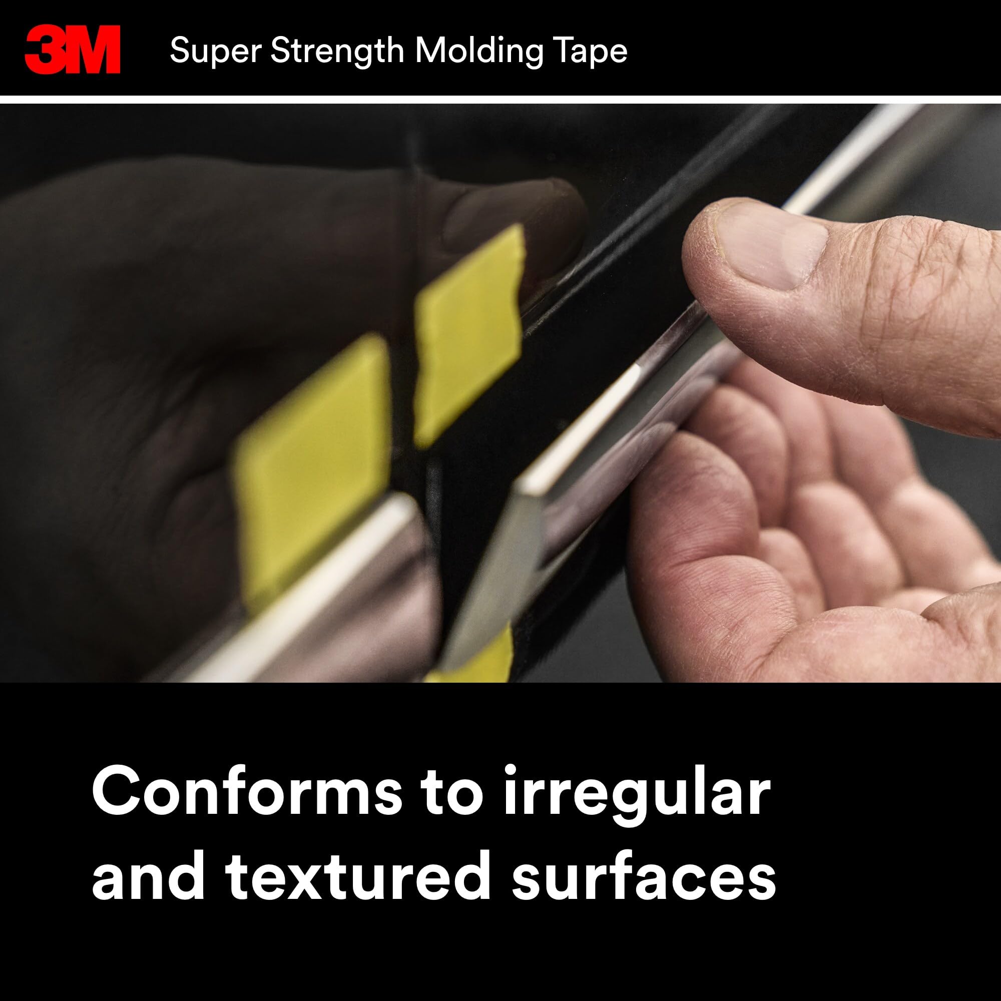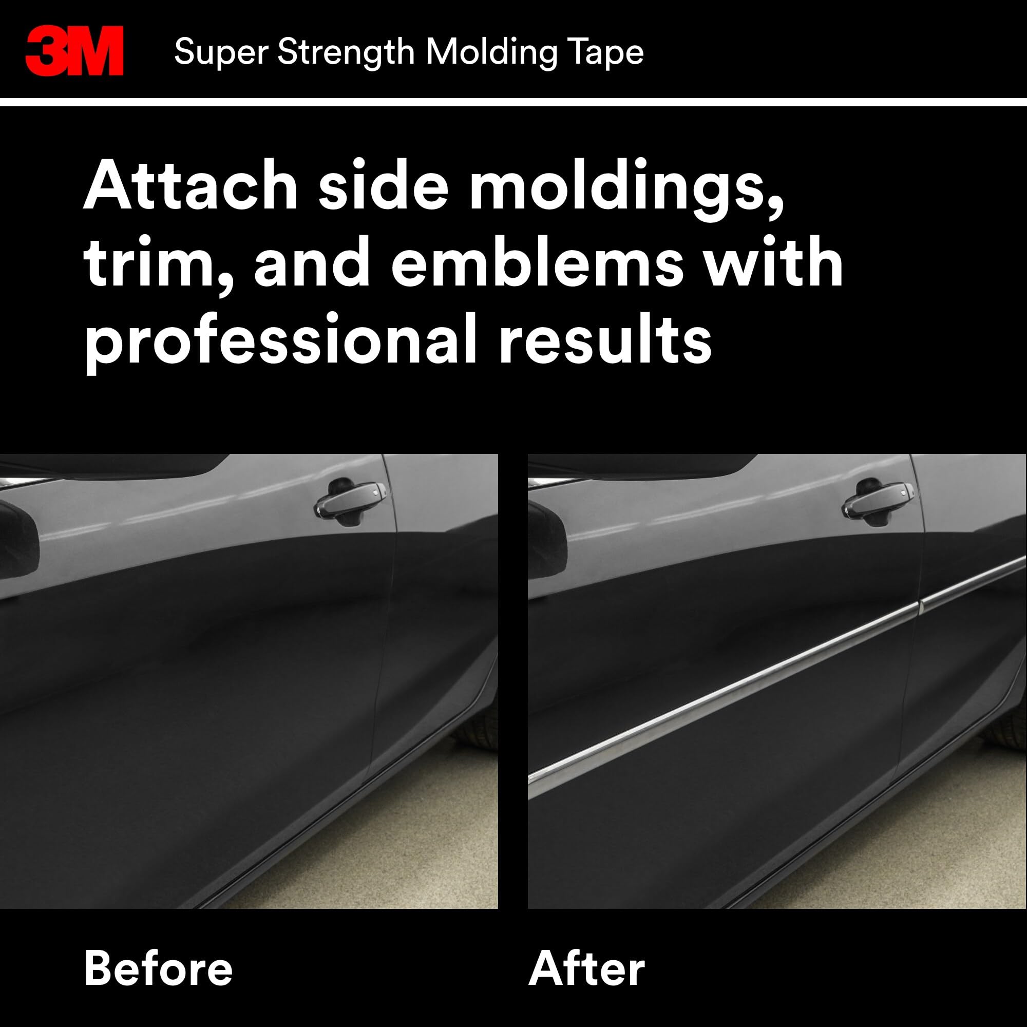 3M Super Strength Molding Tape is ideal for permanently attaching side moldings and trim to your vehicles, adding long-term protection and value. Use the same elastic bonding technology employed for airplanes and skyscrapers to attach body moldings, trim and emblems to your vehicle. This tape features an extremely strong adhesive, and its also easy to use just pull off the liner and apply.