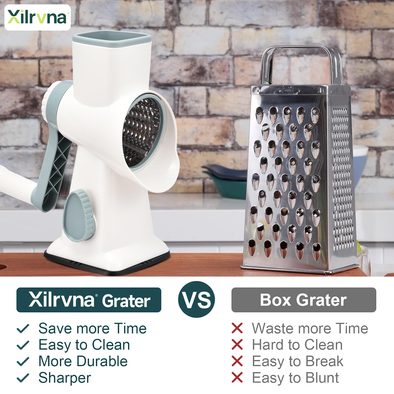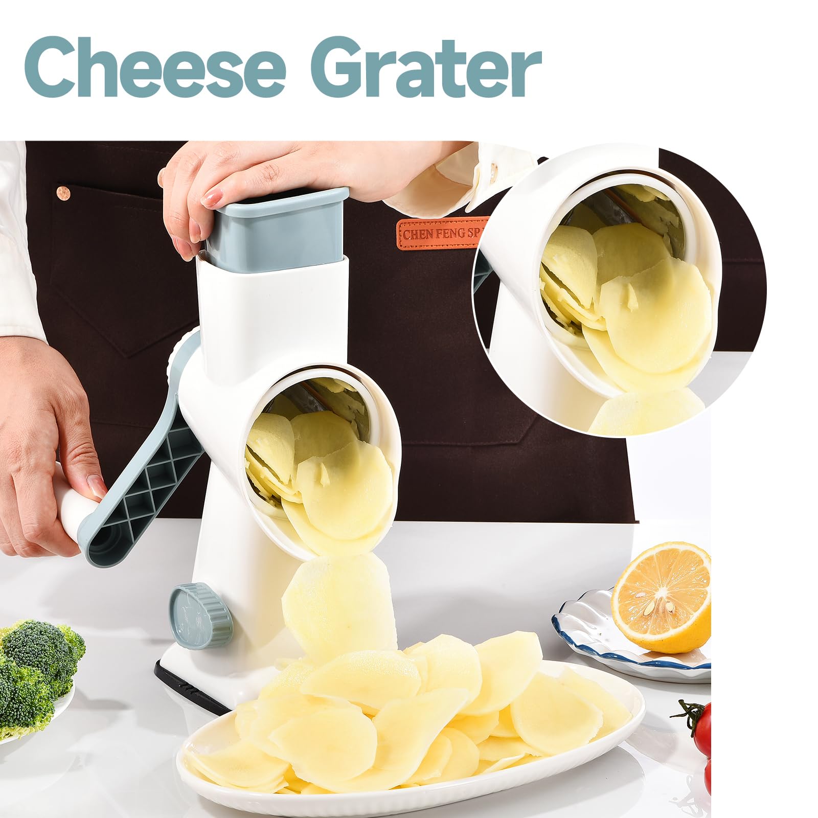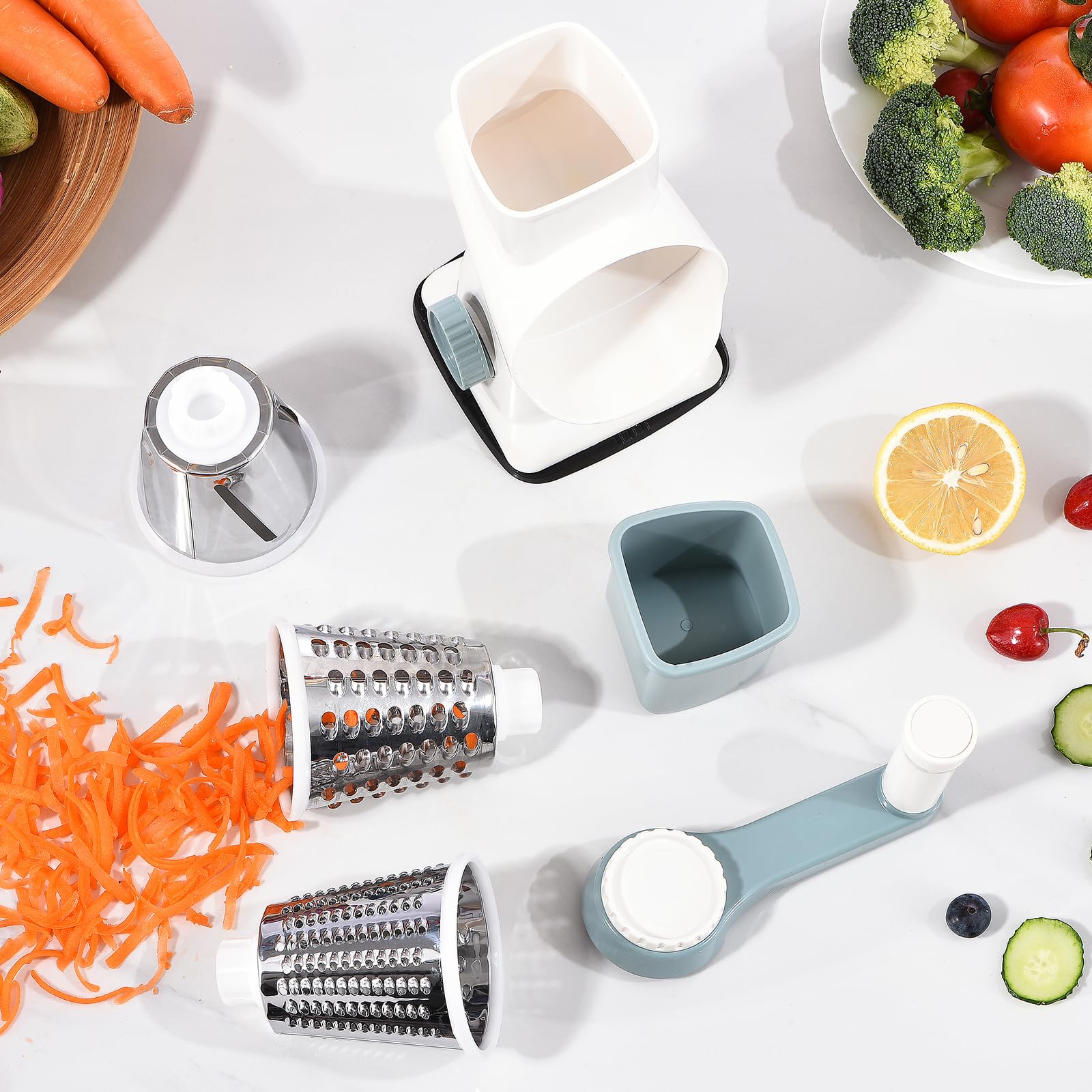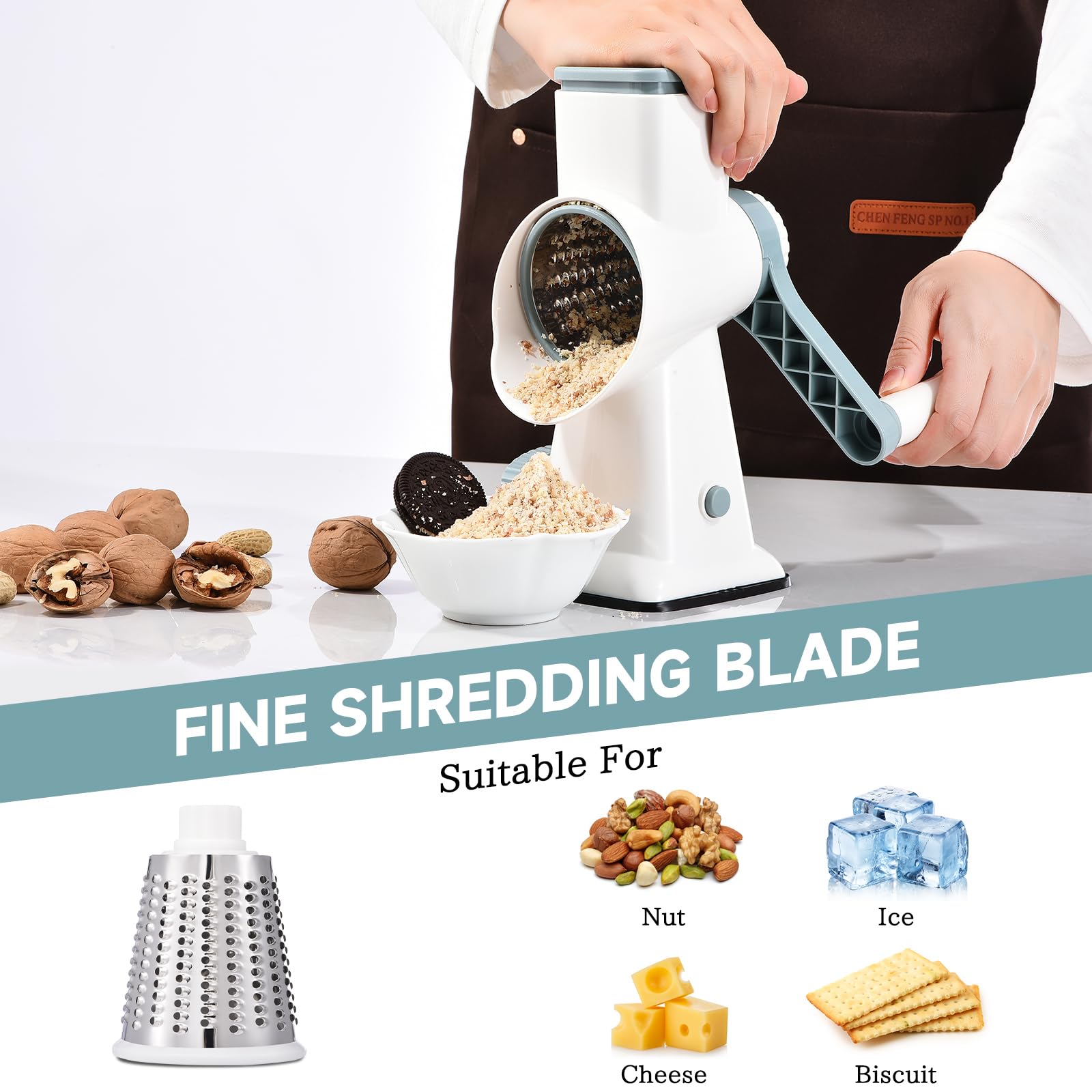 【3-in-1 Kitchen Versatility】Equipped with 3 drum blades for slicing, shredding, and grinding, this grater handles a range of ingredients: cheese, carrots, cucumbers, potatoes, broccoli, chocolate, and more. Use slicing/coarse blades for soft cheese and fine blades for hard cheese.