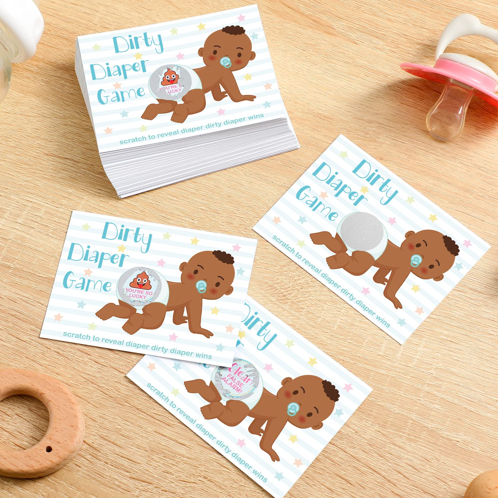 Easy to Use: you just need to paste the scrape off sticker on the corresponding position of the baby shower scratch ticket to cover the words, and people who reveal the poop card is the winner, leaving you a nice and funny using experience