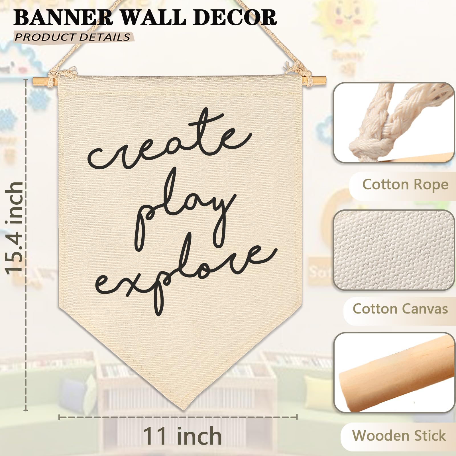 Crafted from natural cotton canvas, this 15.4 x 11 inch nursery wall banner brings a soft and calming touch to baby room, above crib or toddler space. The durable fabric keeps its shape with a natural texture, while the clear print stays bright with everyday use. Lightweight and easy to hang, it comes with a wooden dowel and pre-tied twine for quick setup on walls, doors or shelves. The versatile size fits small spaces without feeling crowded, making it perfect for creating a cozy nursery atmosphere. A thoughtful gift for baby showers, newborn arrival or first birthday.