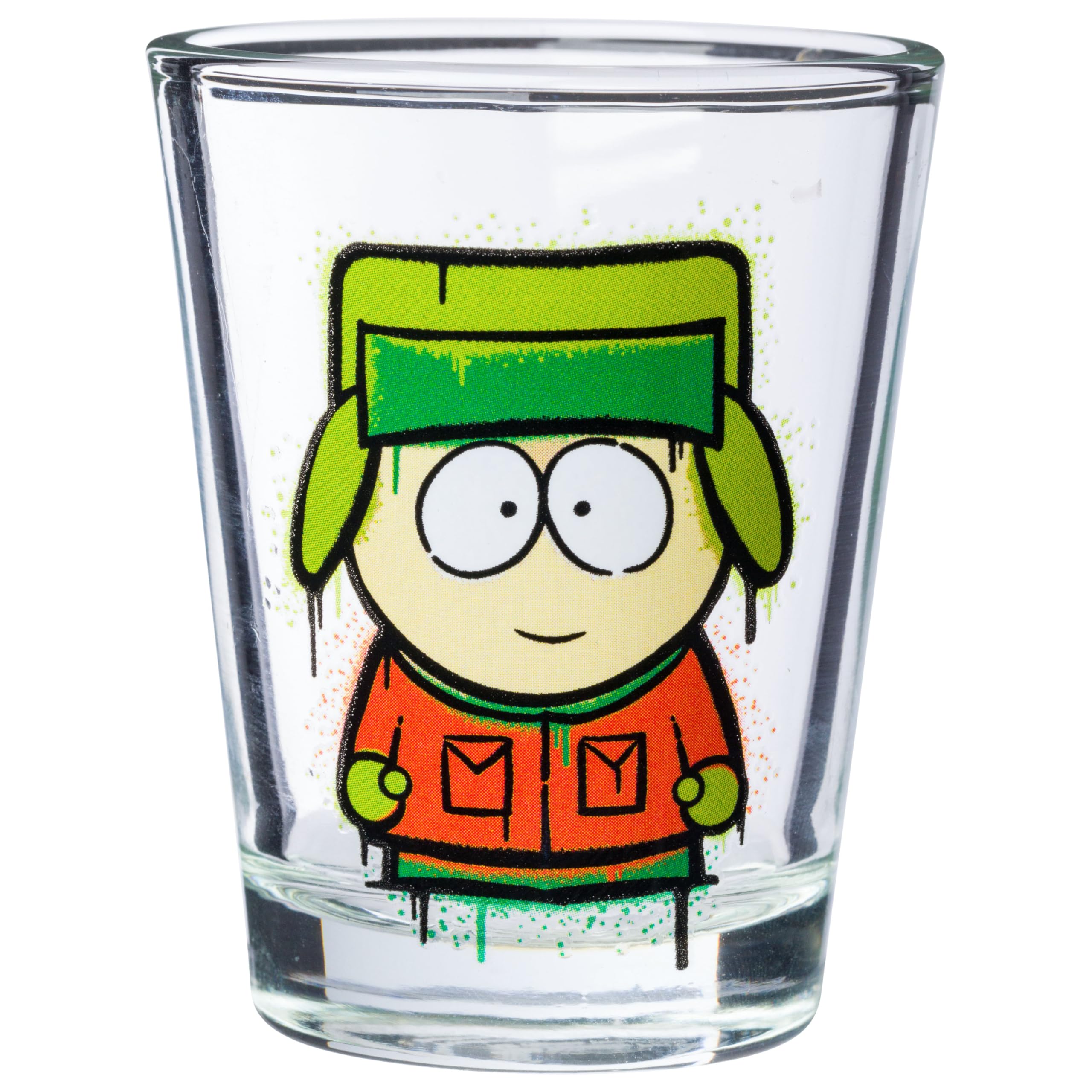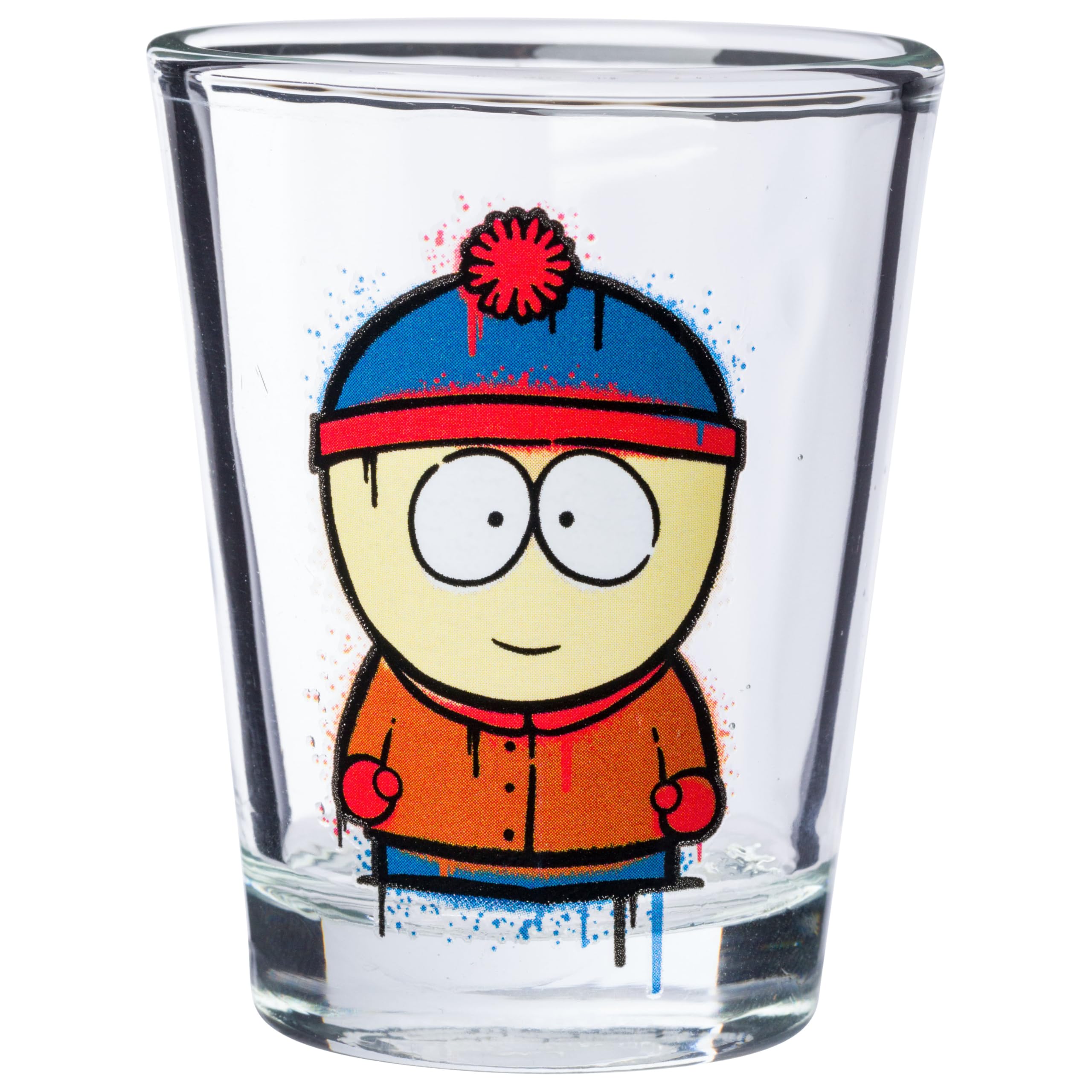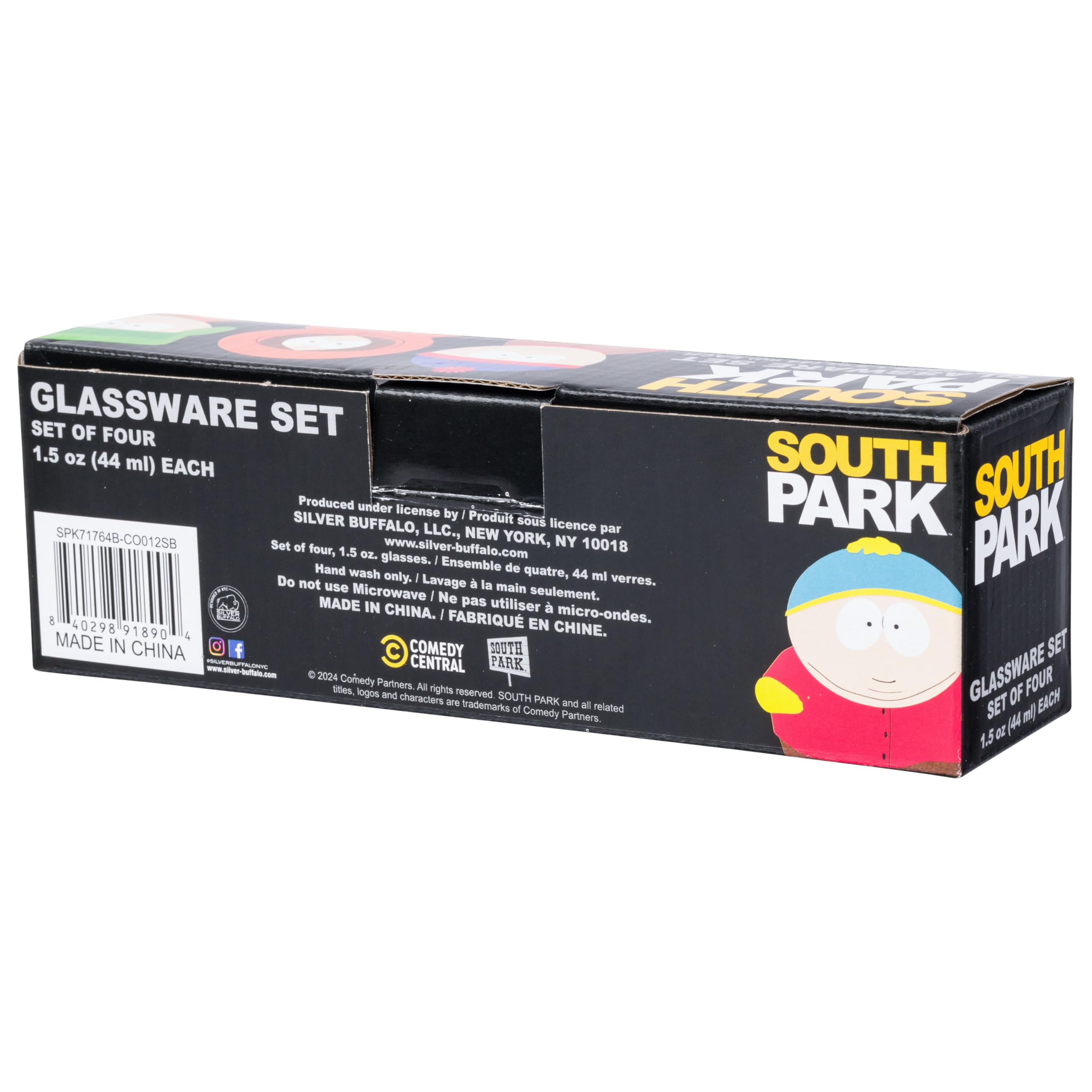 SOUTH PARK MINI GLASS SET: Mini glass set features South Park main characters including Eric Cartman, Stan, Kyle, and Kenny. Each character is showcased on an individual glass in their unique style.