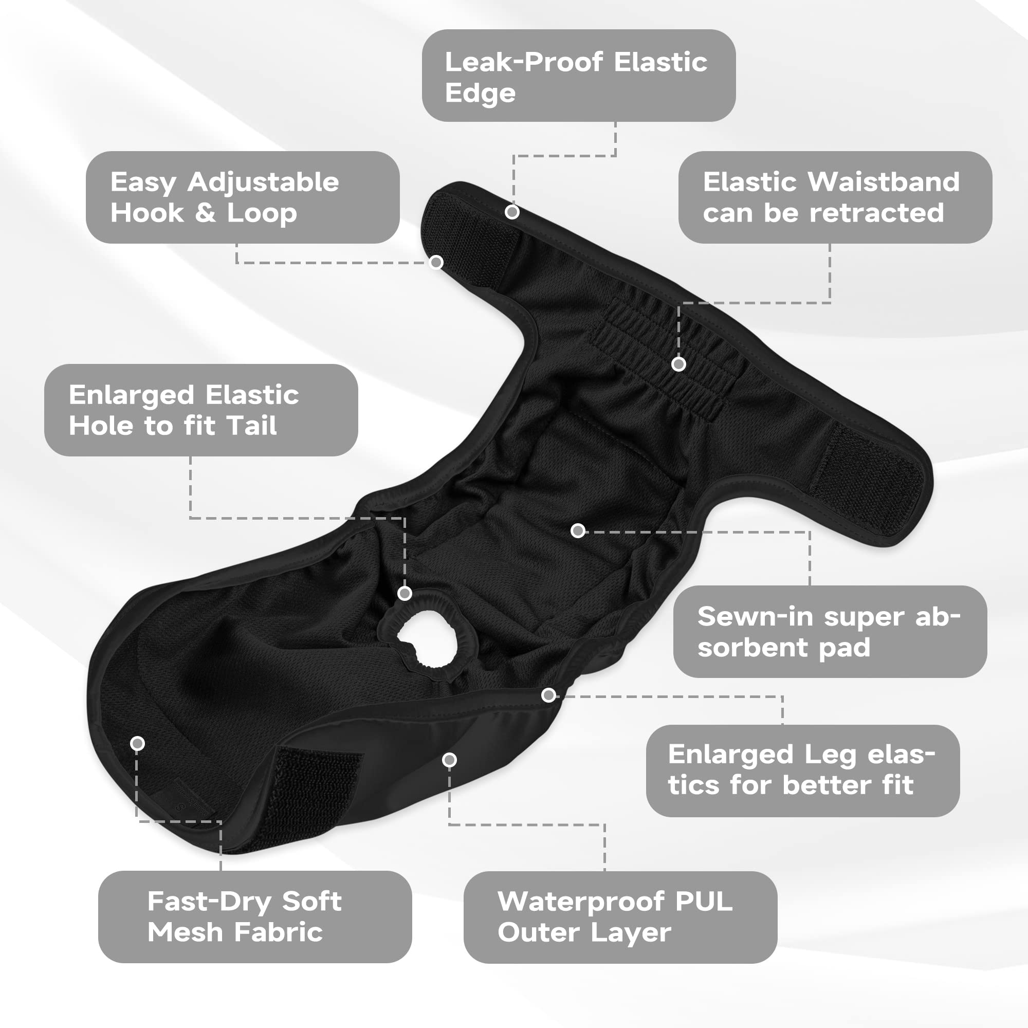 Leak-proof Design: Features sewn-in high-absorbency pads and fast-dry mesh fabric for breathability and comfort. The waterproof outer layer prevents leaks, controls odors, and ensures your dog stays dry and clean, preventing messes and accidents.