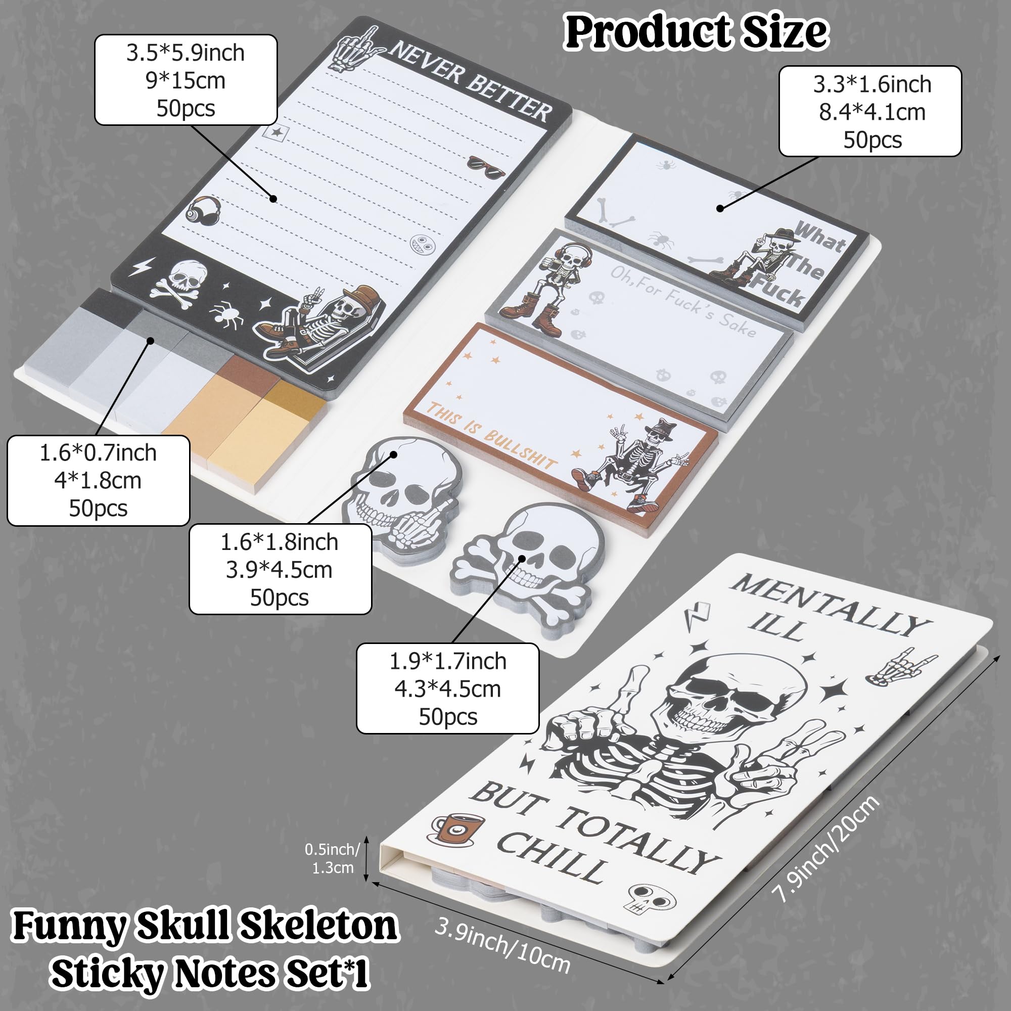 Funny Skull Skeleton Sticky Notes: The cover of the set and the sticky notes inside are designed with funny skull motif. The sticky notes have quirky patterns with rock gestures, bones, skeletons, believe that you will love it.