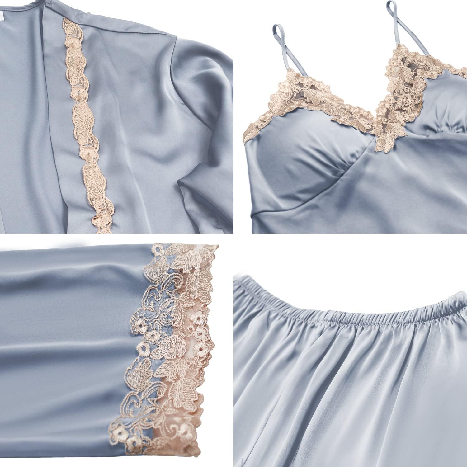 Features--- 5 Piece comfort sleepwear pajama set , include sexy cami dress, cami tops, shorts, long pants and silk robe with belt, with lace makes the sleepwear sexy, with chest pad, detachable. The silk pajamas for women will make you feel silky smooth,luxurious and comfortable,give you best dress experience.