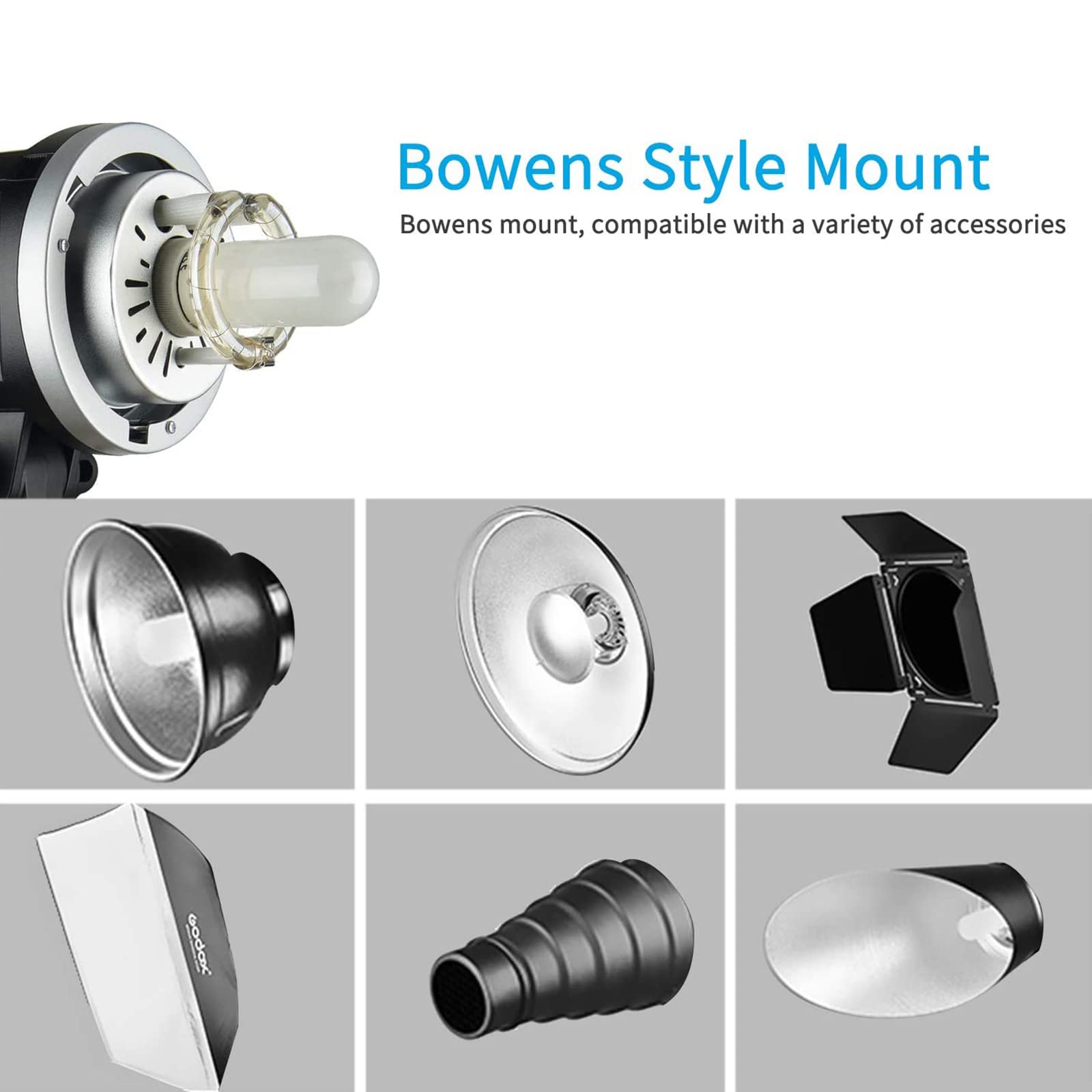 lightweight and Compact:Length of flash with lamp cover only 28.3cm, Net Weight Approx 1.3kg. and compatible with bowens mount Accessories. [Noted]: please take off the Lamp Cover before using.