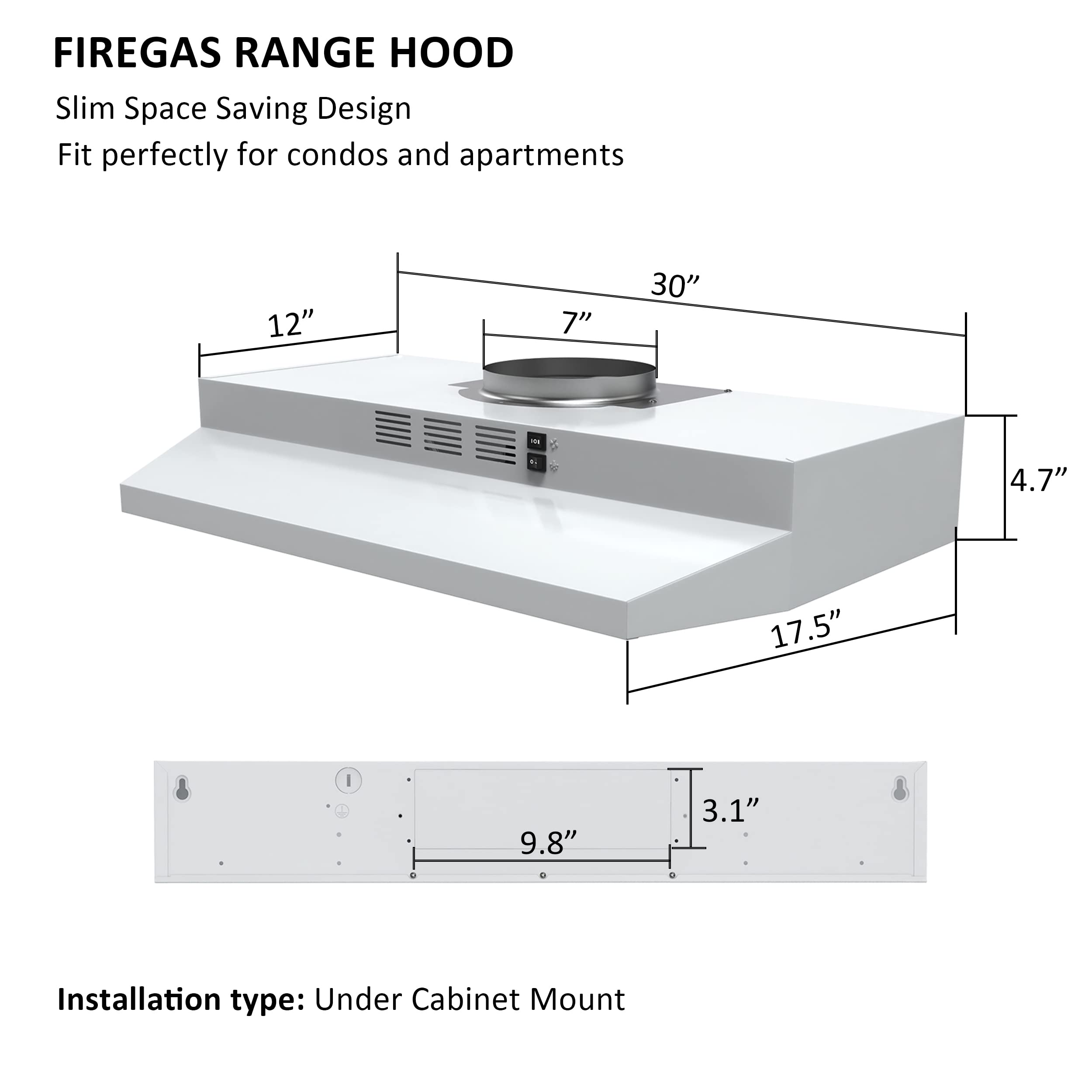 QUALITY KITCHEN HOOD: Under cabinet range hood constructed with high-quality steel for exceptional resistance to corrosion and rust. 30 inch range hood with Multi-layers aluminum filter ( charcoal filter sold separately, model: FGS-TF39-LW) trap grease and oil efficiently.