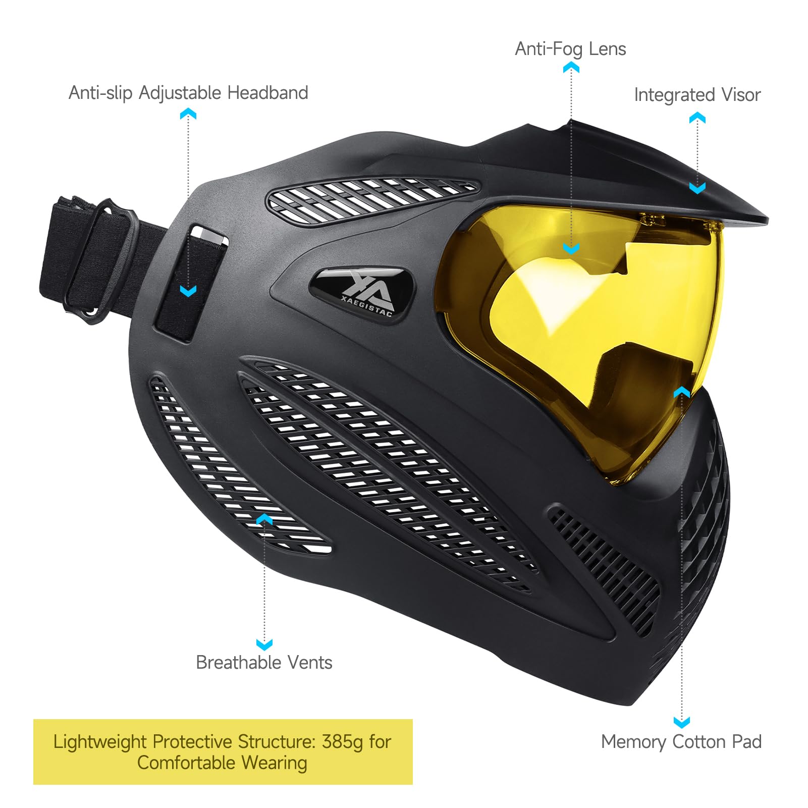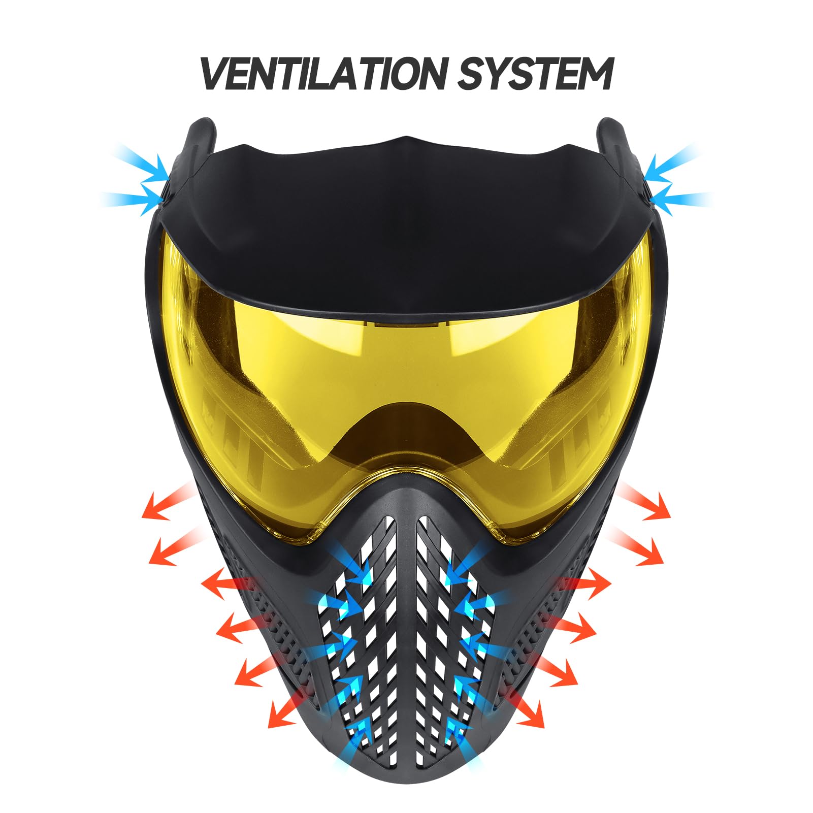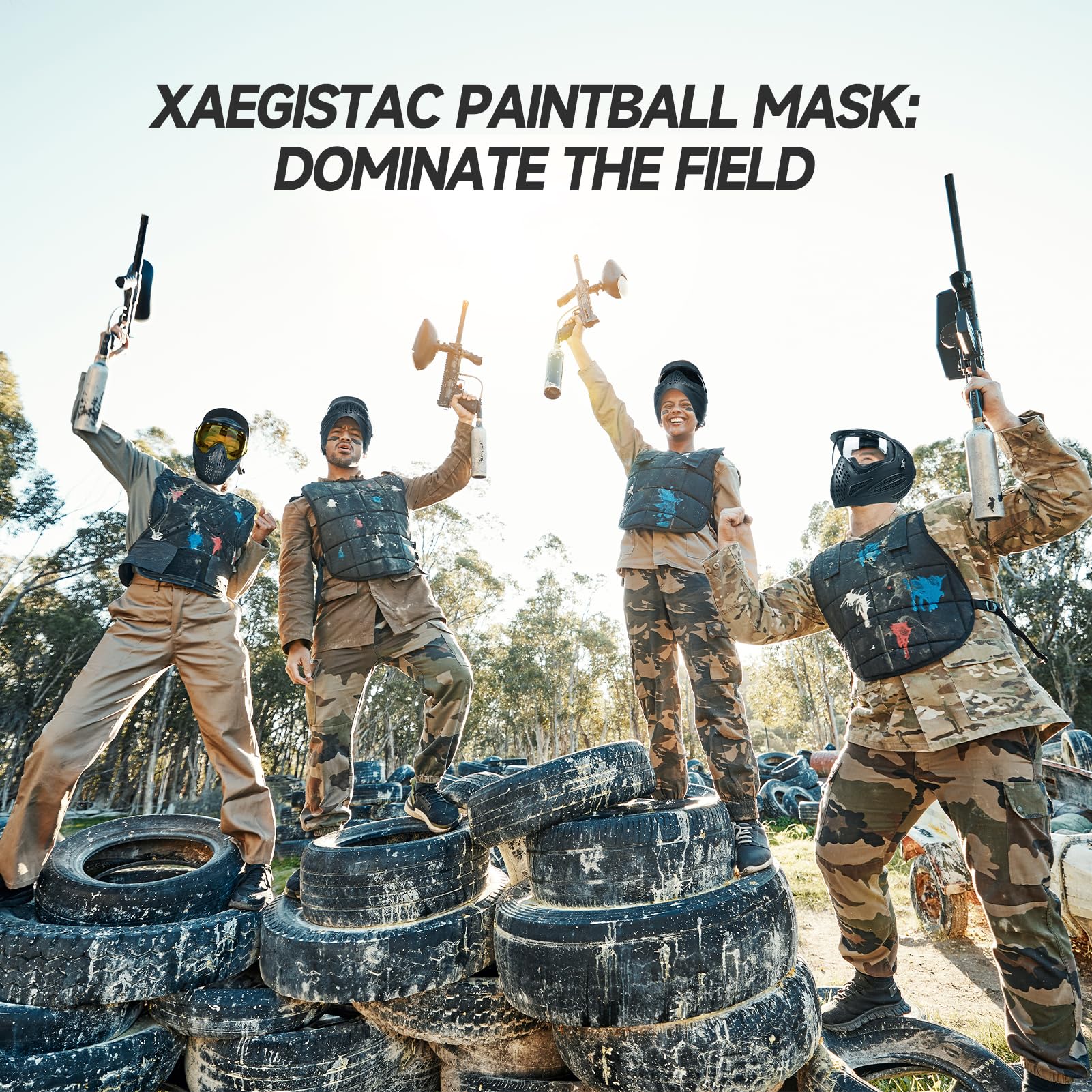 Xaegistac paintball mask with 210 ° ultra wide field of view: The one-piece curved lens provides a 210 ° panoramic field of view, and the curved surface design eliminates visual blind spots and quickly captures dynamic targets; The impact resistance of the lens can be comparable to the ANSI Z87.1 safety standard, withstanding a 200FPS high-speed paintball or airsoft impact