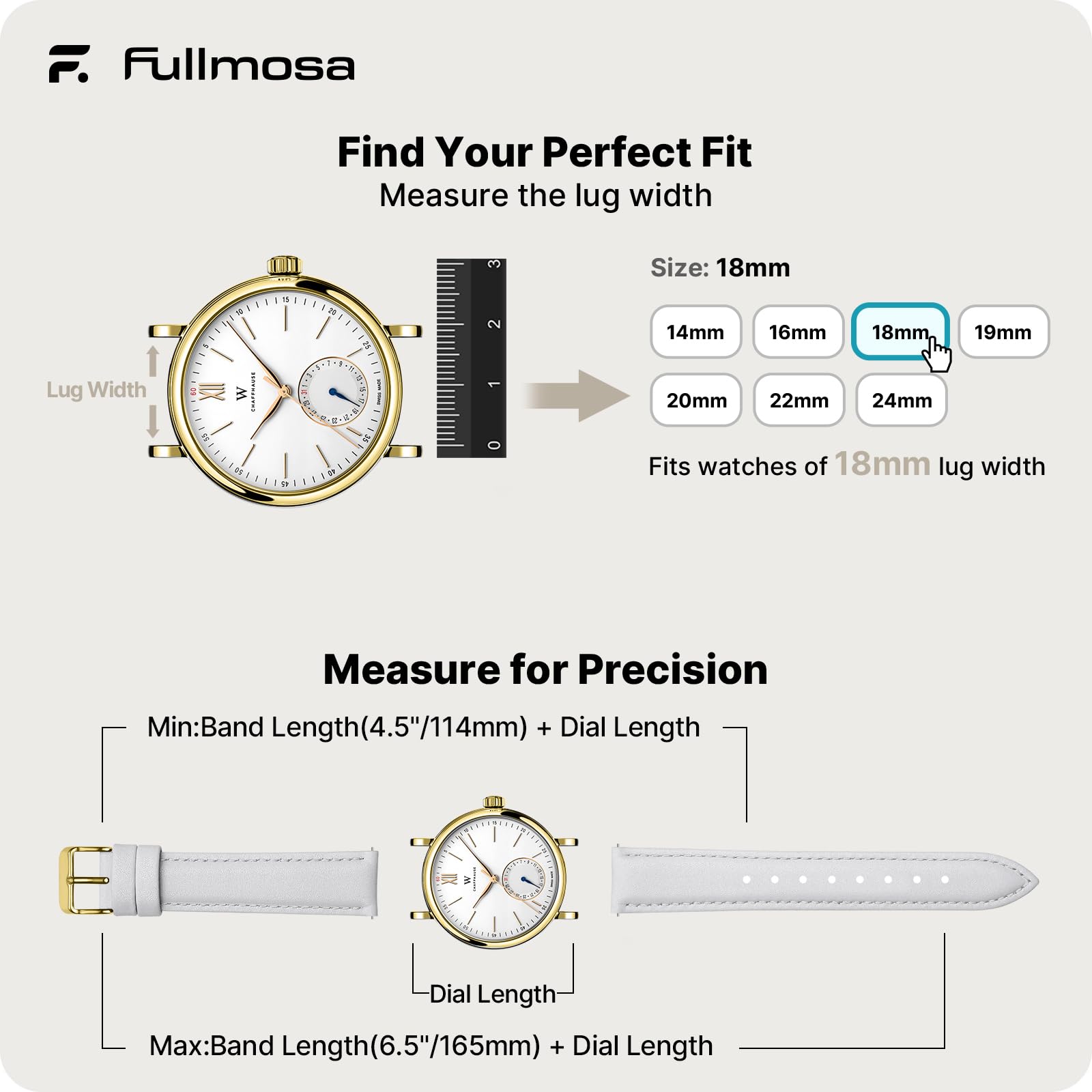 [Adjustable and Perfect Fit] These 18mm watch bands suit 18mm watches only and are not compatible with 17/19mm. Before you order, measure the breadth of your watch lugs. Please see the image below for the measurement and equivalent width of the smart watch, or contact us directly. The 18mm bands fit wrist (4.5"+dial length)--(6.5"+dial length). They also have 10 precisely cut eyelets.