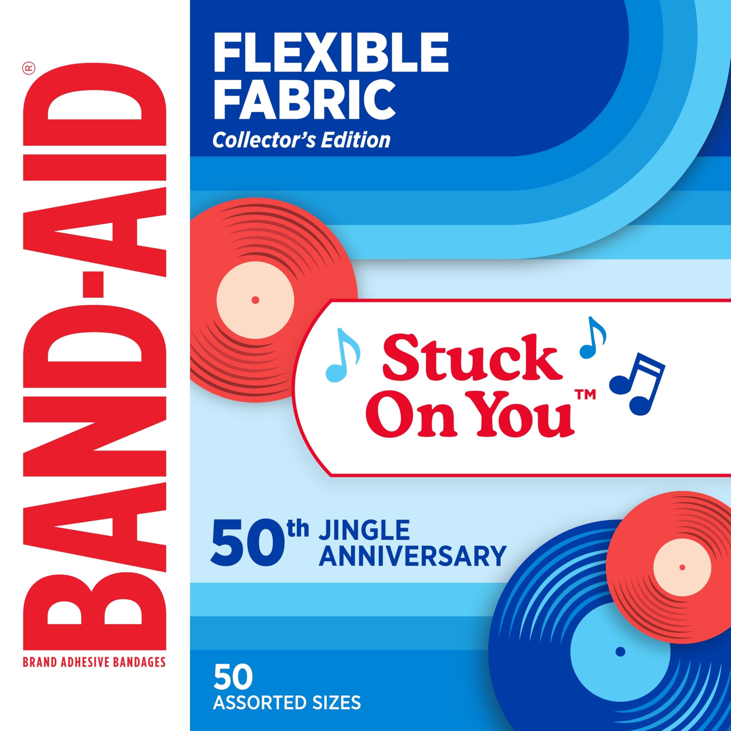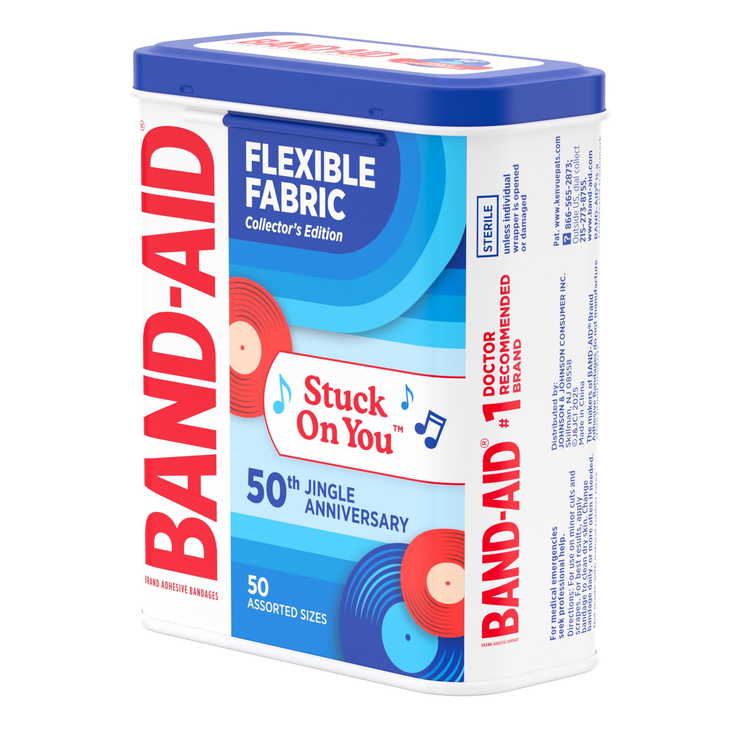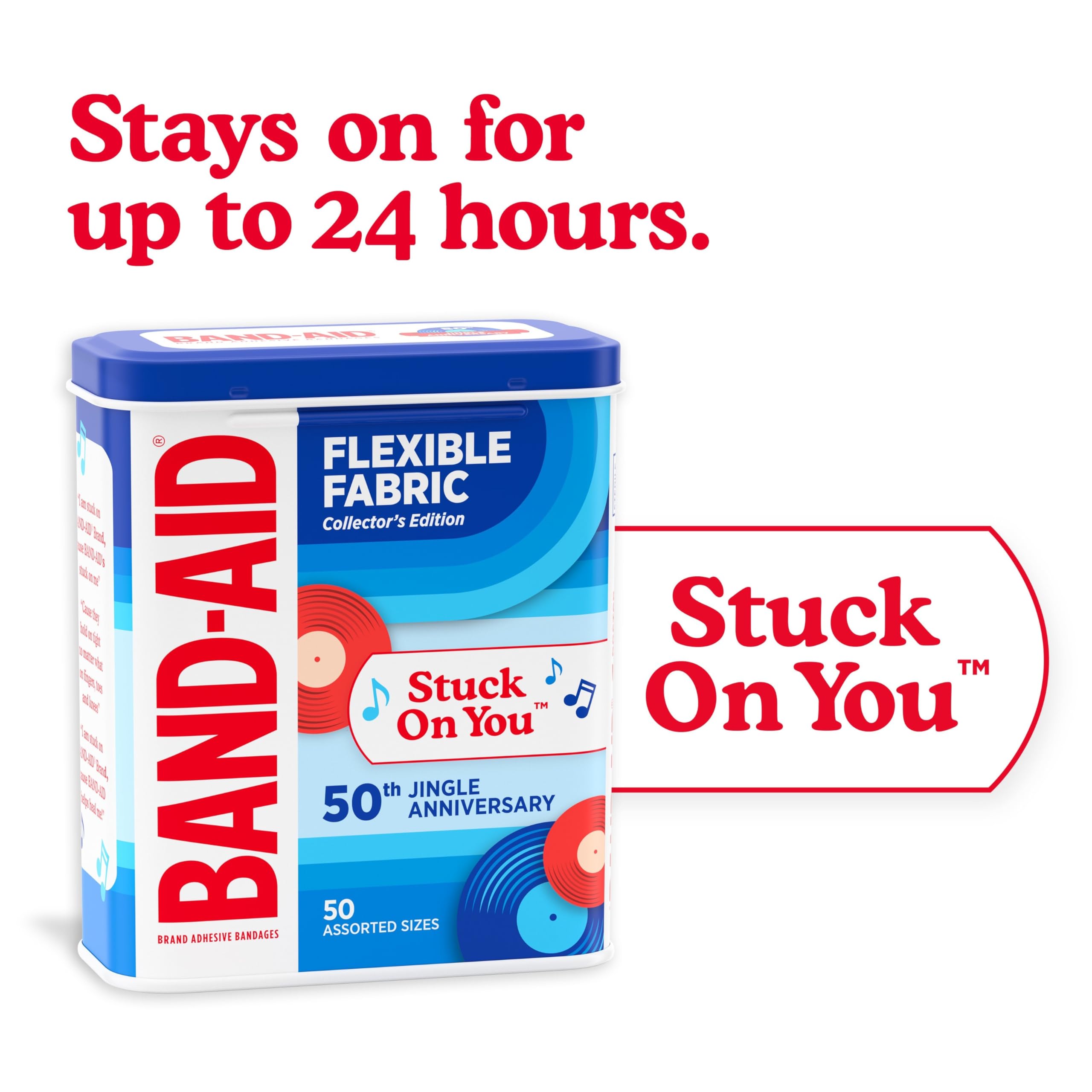 50-count assorted sized BAND-AID Brand Adhesive Bandages, Jingle Anniversary Tin edition for first aid & wound protection of minor wounds & cuts packaged in a collectable metal tin celebrating the 50th Anniversary of the Stuck on You Jingle