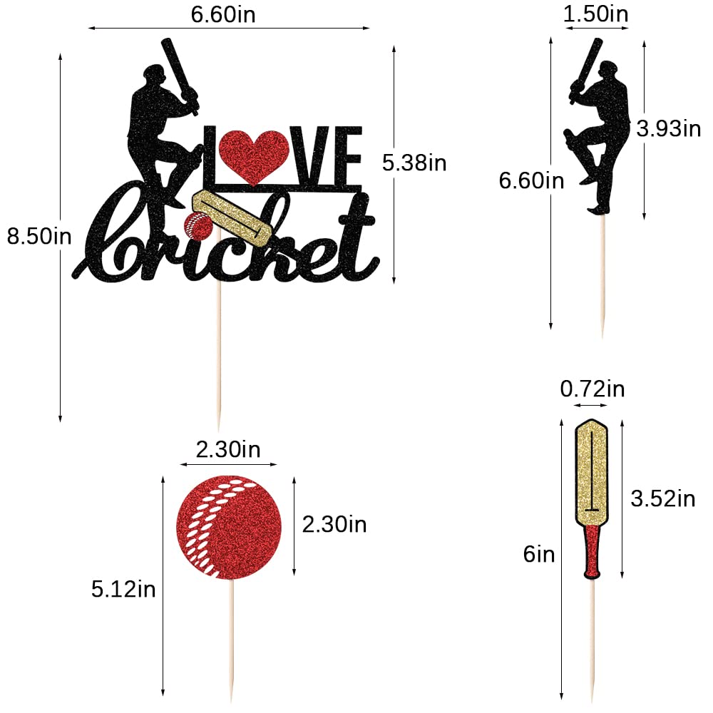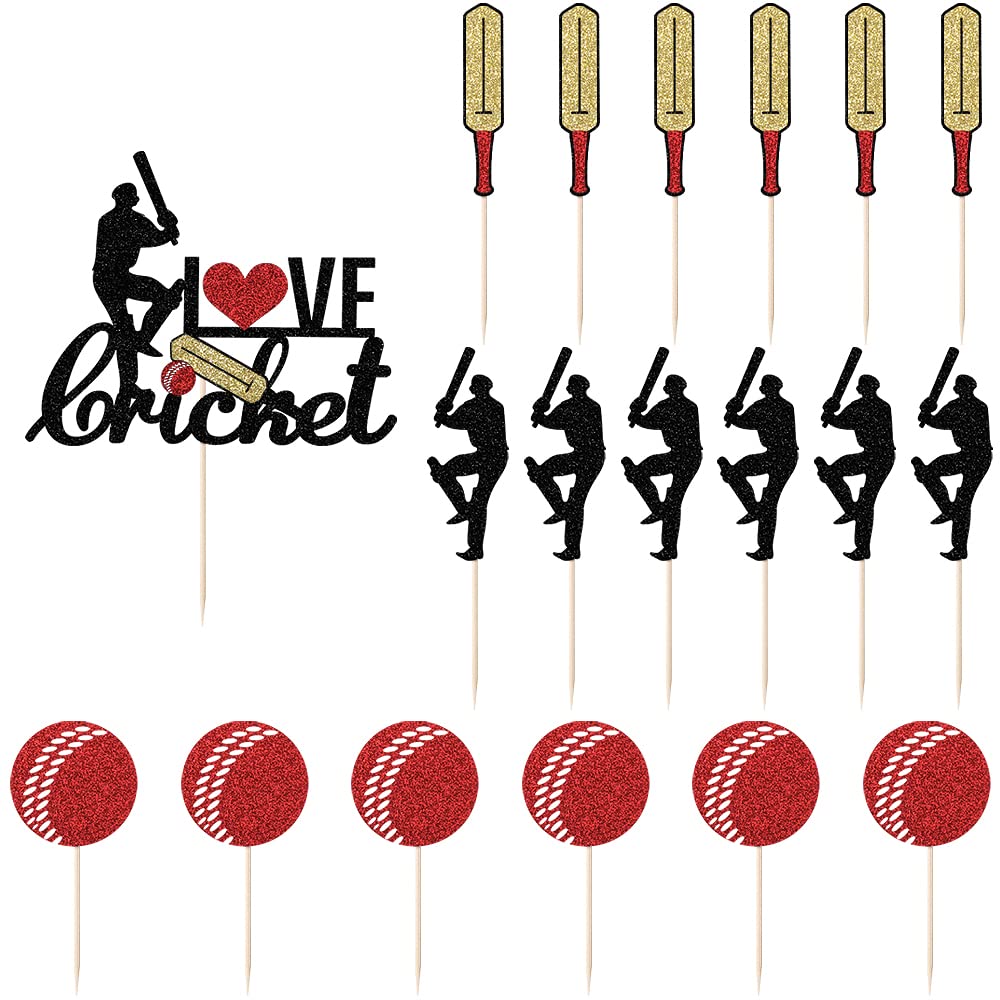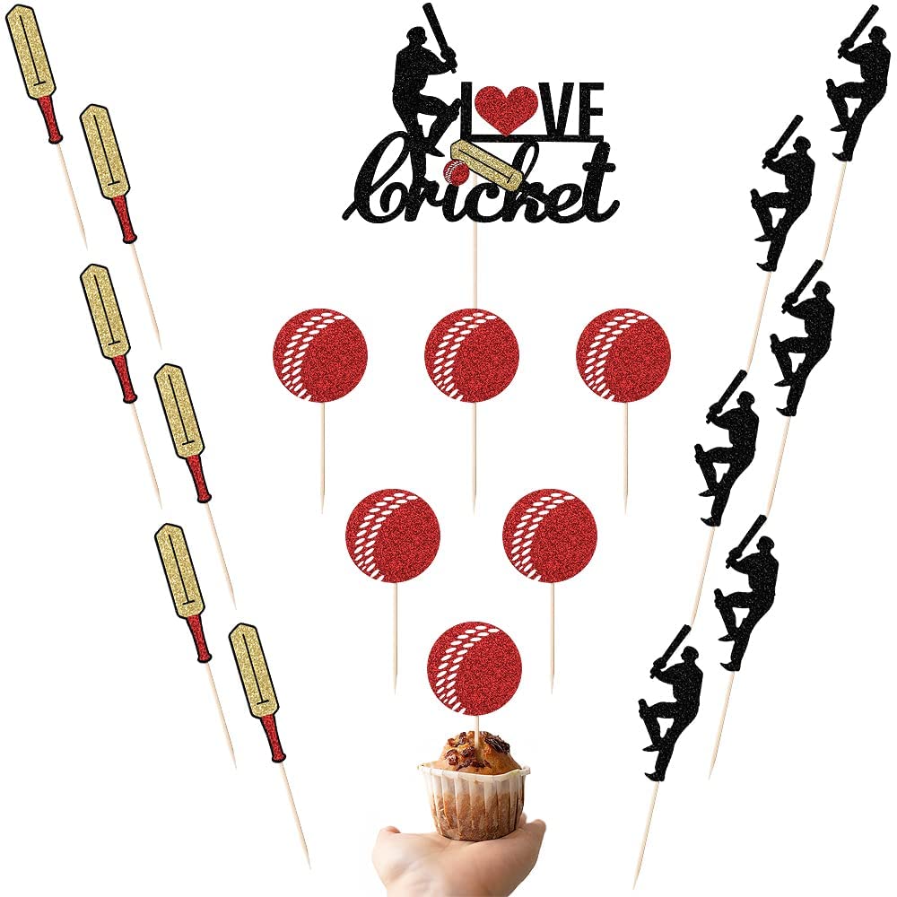 Products include 19PC Cricket cupcake hats. (with glitter on the front and pure white on the back, the gold dust won't fall off the food) suitable for most party cake decorations