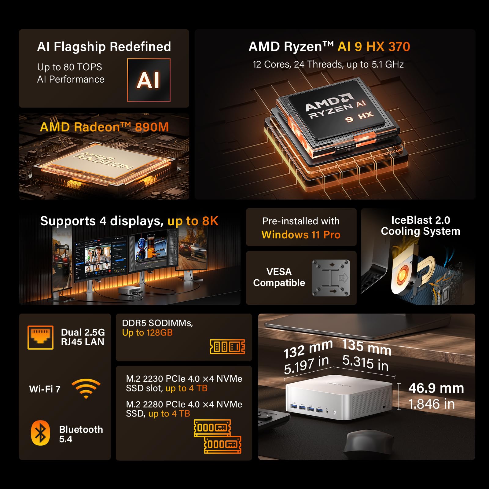 โจ [๐๐ผ๐บ๐ฝ๐ฎ๐ฐ๐ ๐ฌ๐ฒ๐ ๐ฃ๐ผ๐๐ฒ๐ฟ๐ณ๐๐น] Measuring just 5.31 in ร 5.20 in ร 1.80 in, the A9 Max mini pc fits easily on a desk, in an office, or in the living room. Despite its compact footprint, it packs a 54W TDP flagship CPU with up to 12 high-performance cores and modern I/Oโdelivering desktop-class power for demanding tasks. VESA mount support enables a clean, space-saving setup.