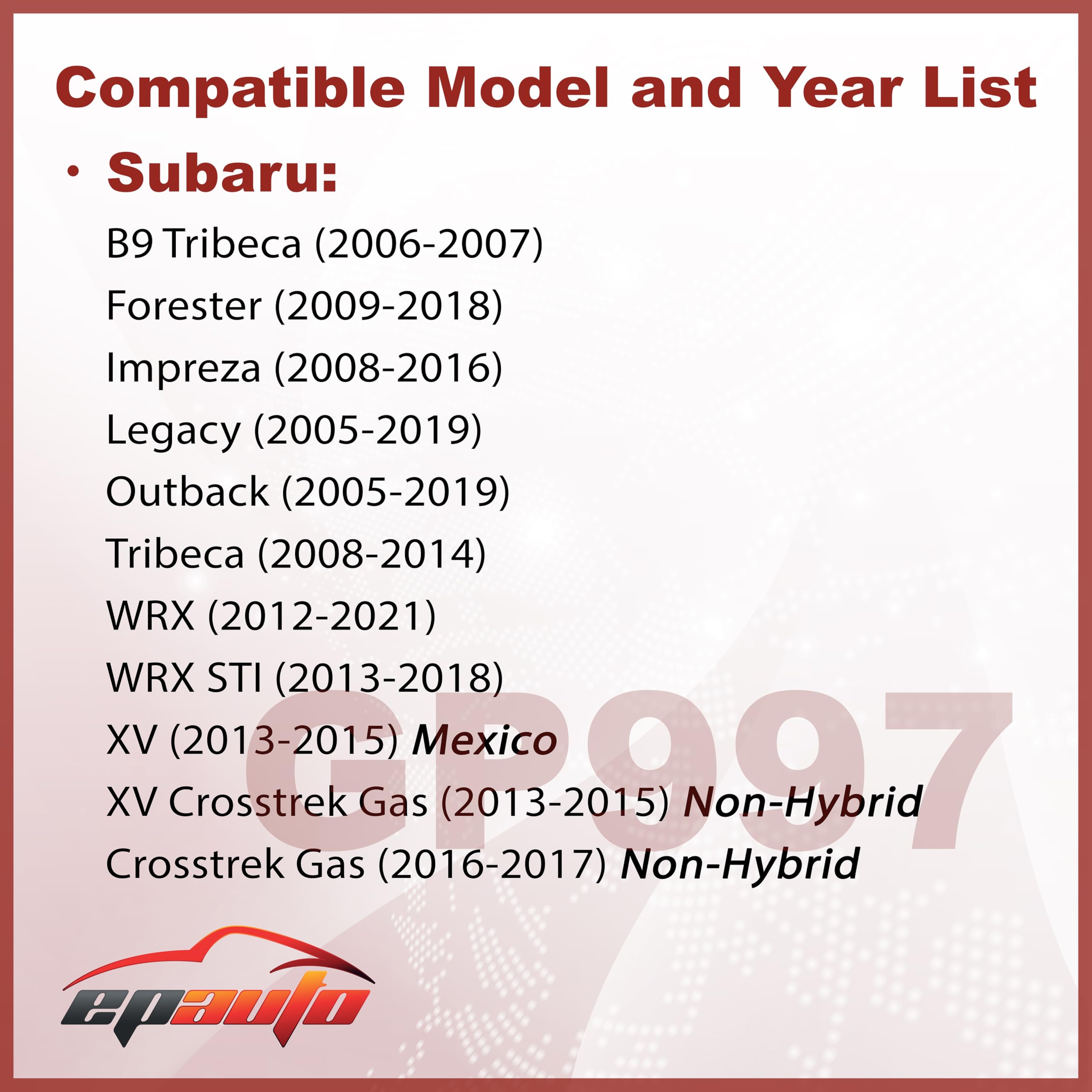 Compatible with Subaru B9 Tribeca (2006-2007), Crosstrek Gas (2016-2017), Forester (2009-2018), Impreza (2008-2016), Legacy (2005-2019), Outback (2005-2019), Tribeca (2008-2014), WRX (2012-2021), WRX STI (2013-2018), XV (2013-2015 Mexico), XV Crosstrek Gas (2013-2015)
