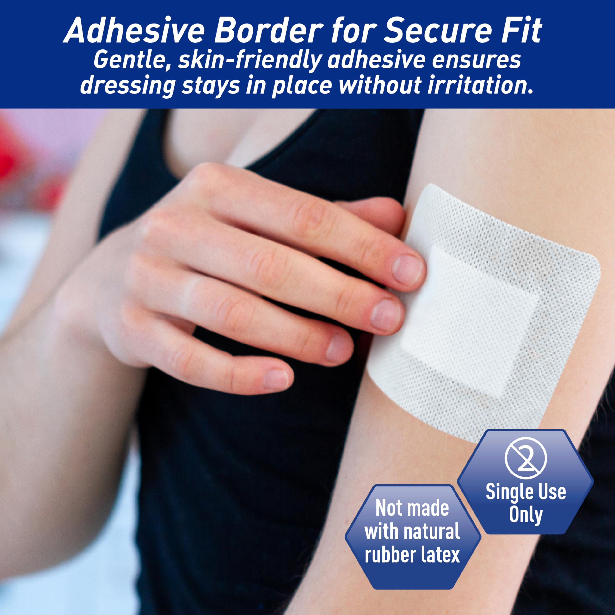 EASY TO USE & CHANGE: Targeted wound dressing that is completely hassle free and easy to do, much more so than regular gauze and tape. The adhesive borders help it to stay in place, absorb small leakages, and protect the affected area.