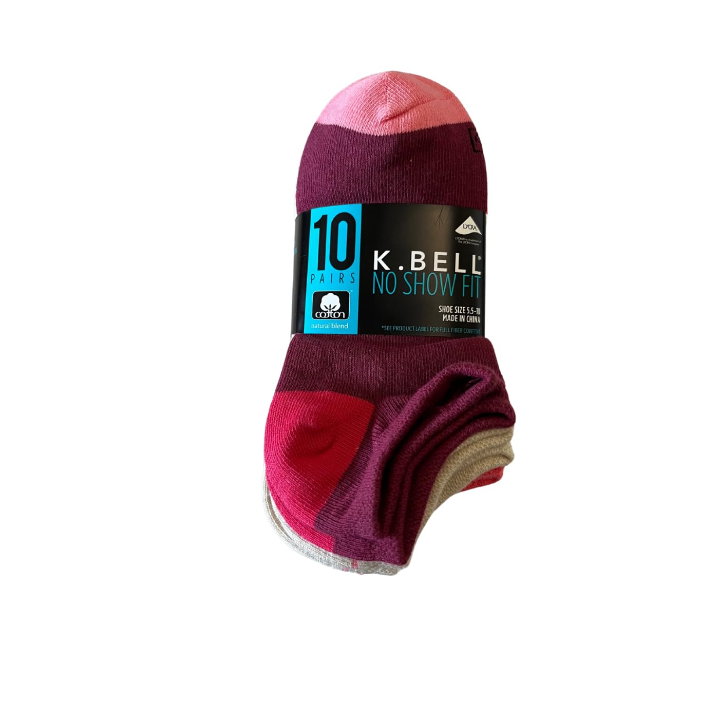 Description K. Bell no show pack contains (6) solid color block pairs and (4) stripe pairs. Soft cotton blend. Signature No-slip pocket heel. Great fit, fashion and comfort. Made from 80% Cotton, 17% Nylon, 3% Spandex. Fits Shoe size 5.5-10. Care Instructions: Machine wash cold Do not bleach Tumble dry low.