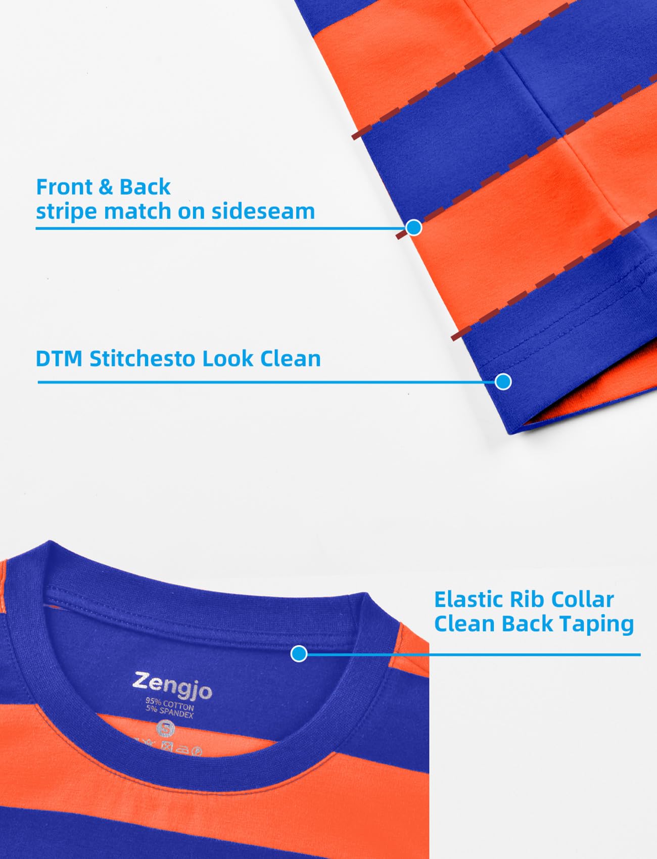 Details: Pull on closure,stretch Rib collar for deformation resistant. Horizontal stripes alignment on the side seam. Tidy stitches on the stipes.