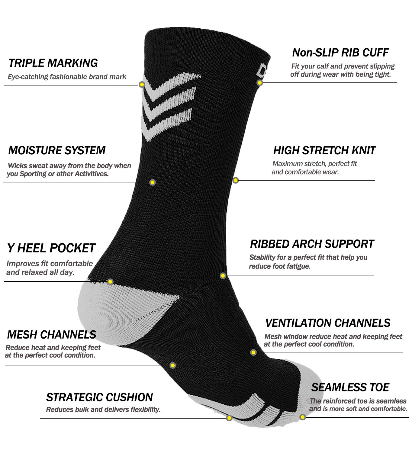 Dri-Technology offer Breathable, moisture wicking fabric keep your feet dry with unique max ventilation, circular knit mesh channels engineered for good air ventilation and moisture control. Knitted moisture transport channel wicks sweat away from the body when you Sporting, avoid redness and odors, keep your feet cool.