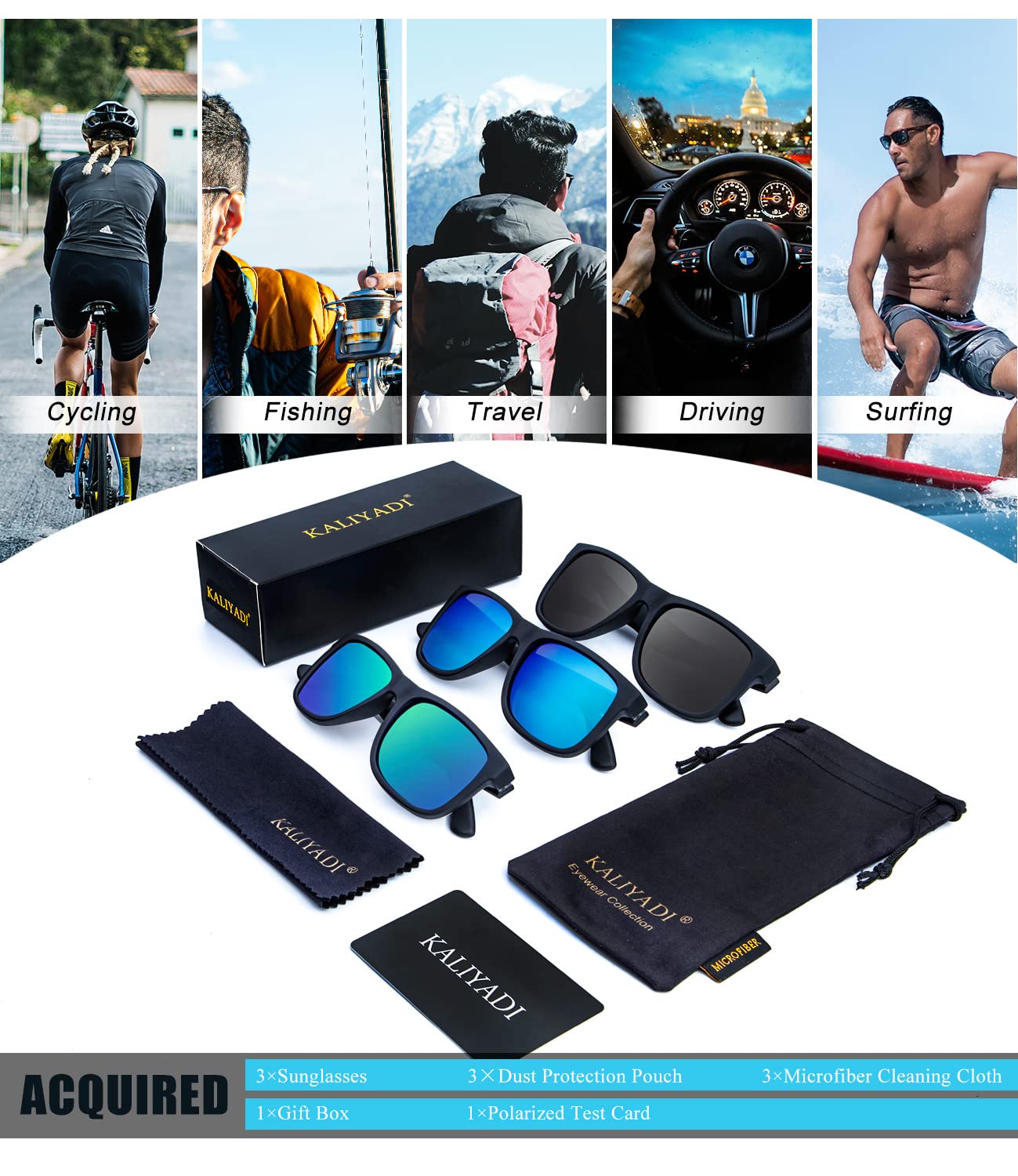 ★ Gift Idea Package and Brand Customer Service ▶ Classic sunglasses*3, microfiber pouch*3, microfiber glasses cleaning cloth*3, gift box*1. Our sunglasses for men women are also gift packed, which will be great gifts for your family and friends! All KALIYADI customers enjoy brand customer service for our polarized sunglasses. The integrity of every box and the quality of the lenses are double checked by third-party companies. And that goes with a lifetime support!