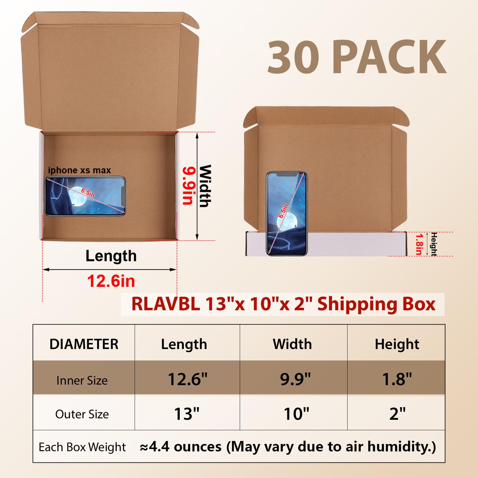 DIMENSION: The shipping boxes set includes 30 packs of the cardboard box. The outer size of this small mailer box is 13” x 10” x 2”(L x W x H), the inner size is 12.6" x 9.9" x 1.8". Suitable for packing or mailing those small and lightweight items.