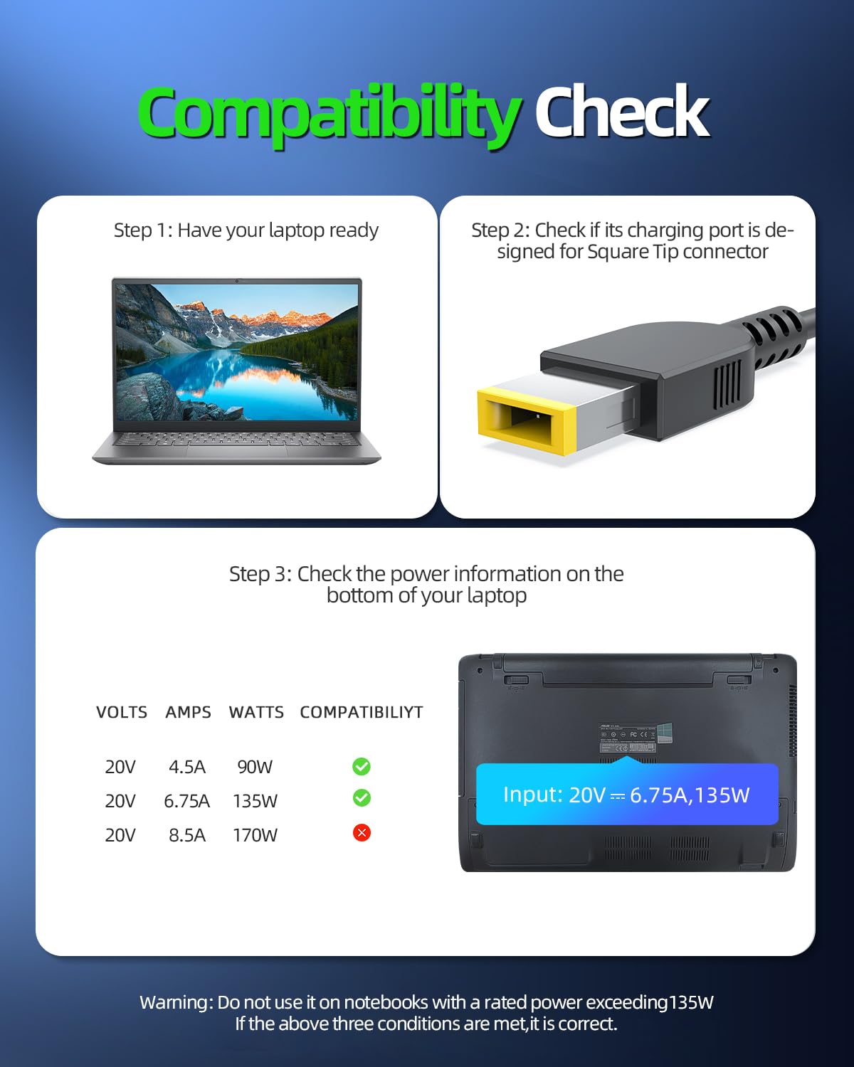 Output Max - 20V 6.75A 135W, compatible with 20V 60A 120W Input Volt Range - 100-240V