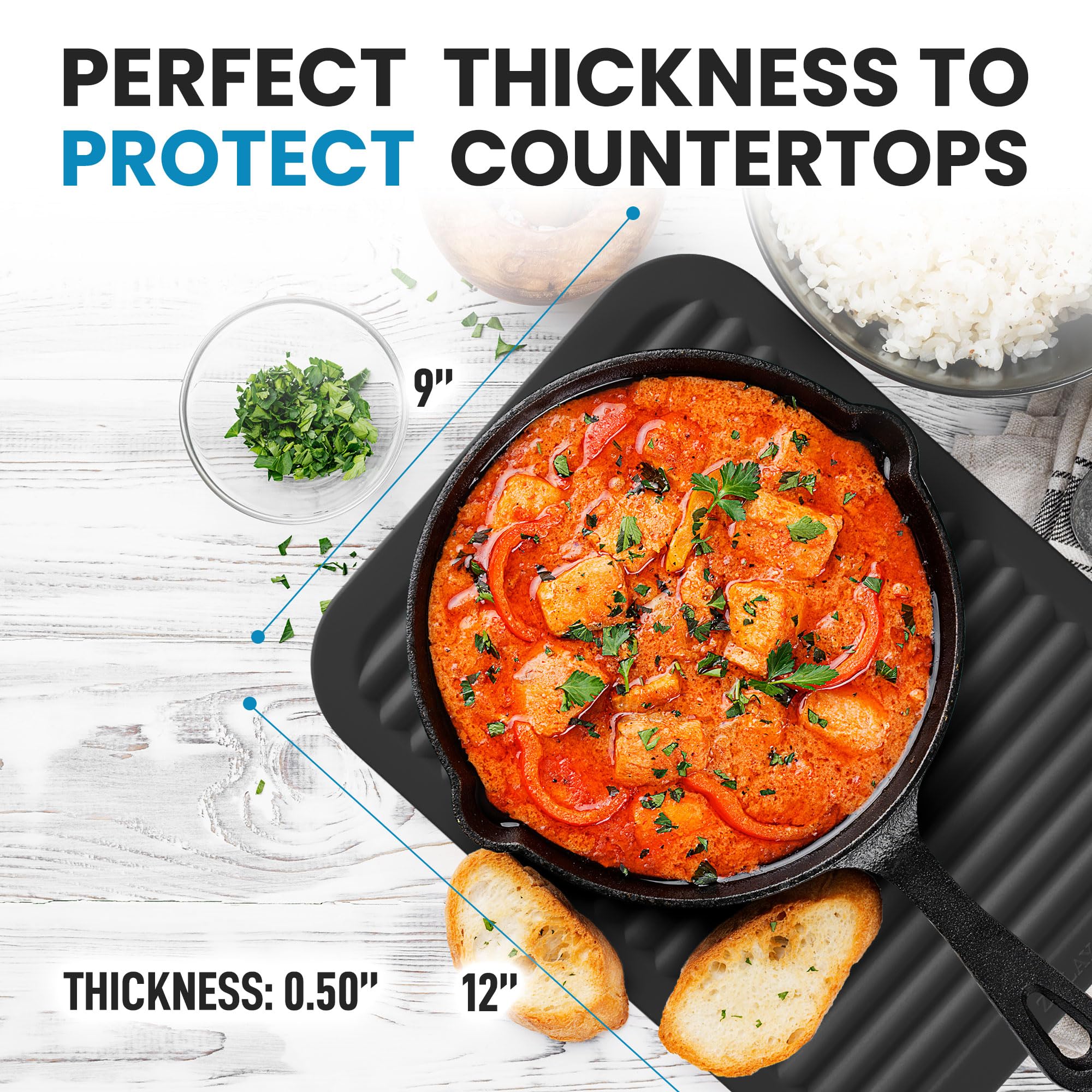 Valued Kitchen Essential: Never worry about your hot casserole skidding off your table or countertop as this silicone pot mat is constructed with non-slip pads, therefore, lessening accidents in the kitchen. Its 12-inch x 9-inch x 0.47-inch rectangular wavy stripe design is great for any surface or kitchen station to catch any oil splashes and spills, cater long casserole pans, or hold hot cookware during baking and cooking!