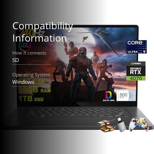 Product Details: Microprocessor: Intel 16-core Ultra 9 185H Memory: 16GB RAM Storage: 1TB SSD Operating system: Microsoft Windows 11 Home Graphics & Video: Dedicated NVIDIA GeForce RTX 4070 8GB Graphic 16" 2.5K (2560 x 1600) OLED 240Hz (DCI-P3 100%, 500nits Brightness, G-SYNC) Key Features: Backlit Keyboard: Yes FHD Camera: Yes Dolby Atmos Audio: Yes Bluetooth: Yes Card Reader: Yes Ports: 1 x Thunderbolt 4, 1 x USB-C 3.2, 2 x USB-A 3.2, 1 x HDMI 2.1 FRL, 1 x SD Card Reader Battery: 4-cell 90Wh Additional Information: Dimension: 9.69" x 13.94" x 0.65" Weight: 4.08 lbs