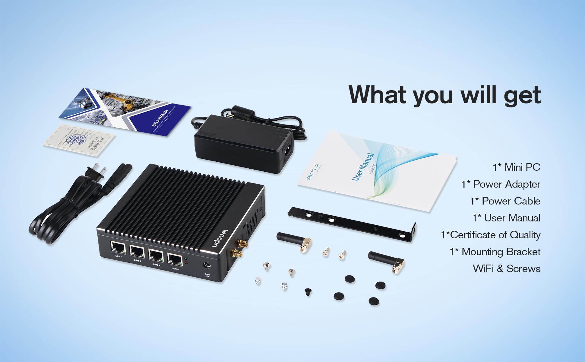【Specifications】4G DDR3 RAM, max support 8GB; 64GB mSATA SSD, up to 512GB. Not support HDD. 4 * 2.5GbE I226 lan ports, 2 * USB3.0 ports, 1 * VGA port, 1 * HD port, 1 * DC port. With VESA mount, it can be installed behind the monitor , save space. Size:5.27 * 4.98 * 1.43 inches, Weigh:500g, Small but powerful.