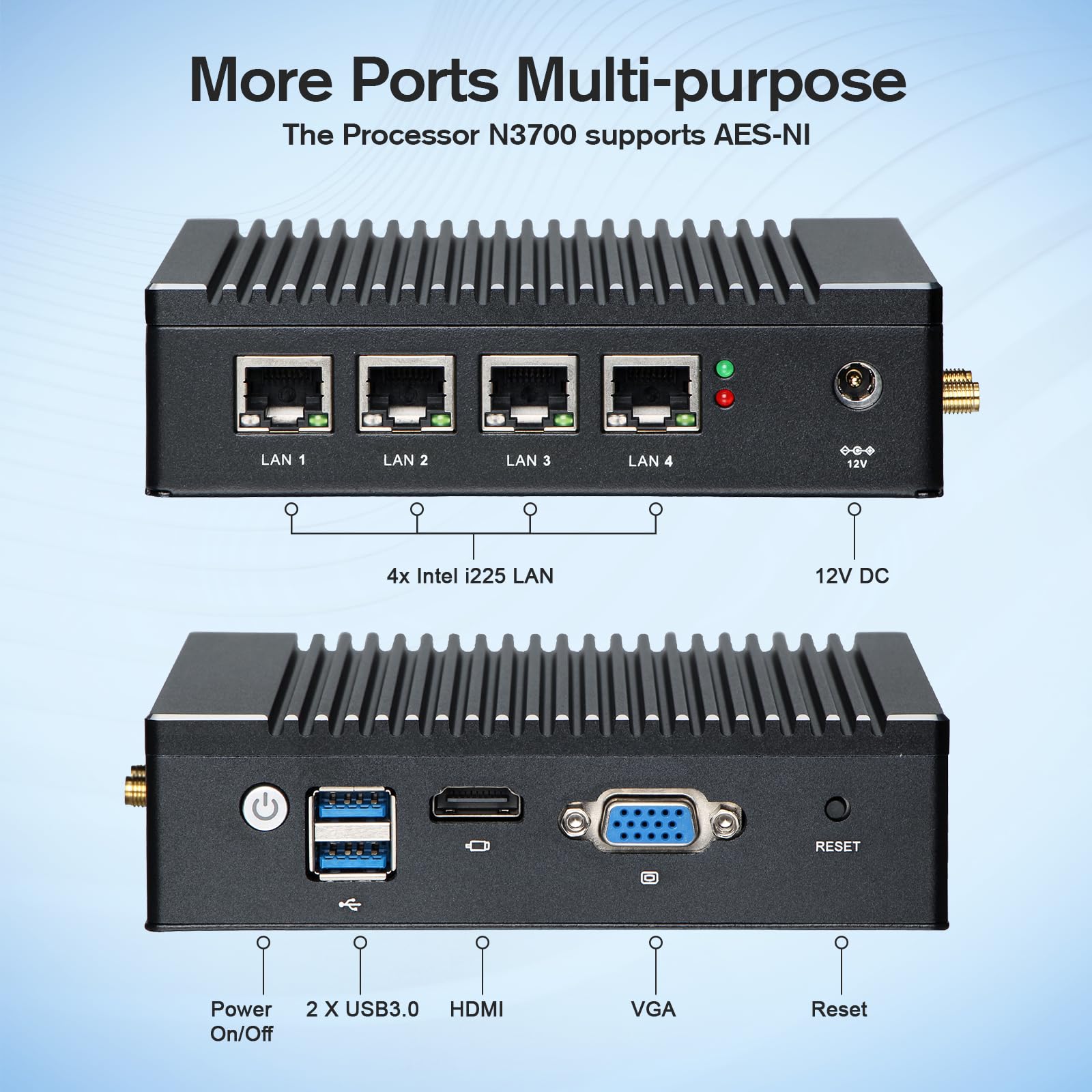 【Processor & OS】Firewall Mini PC with Intel N3700/N3710 CPU up to 2.40GHz, 4Cores4threads 2MB L2 Cache, TDP 6w, supports AES-NI. It tested with pf-sense linux ubuntu and other popular open source os. ("DEL" key to enter BIOS)