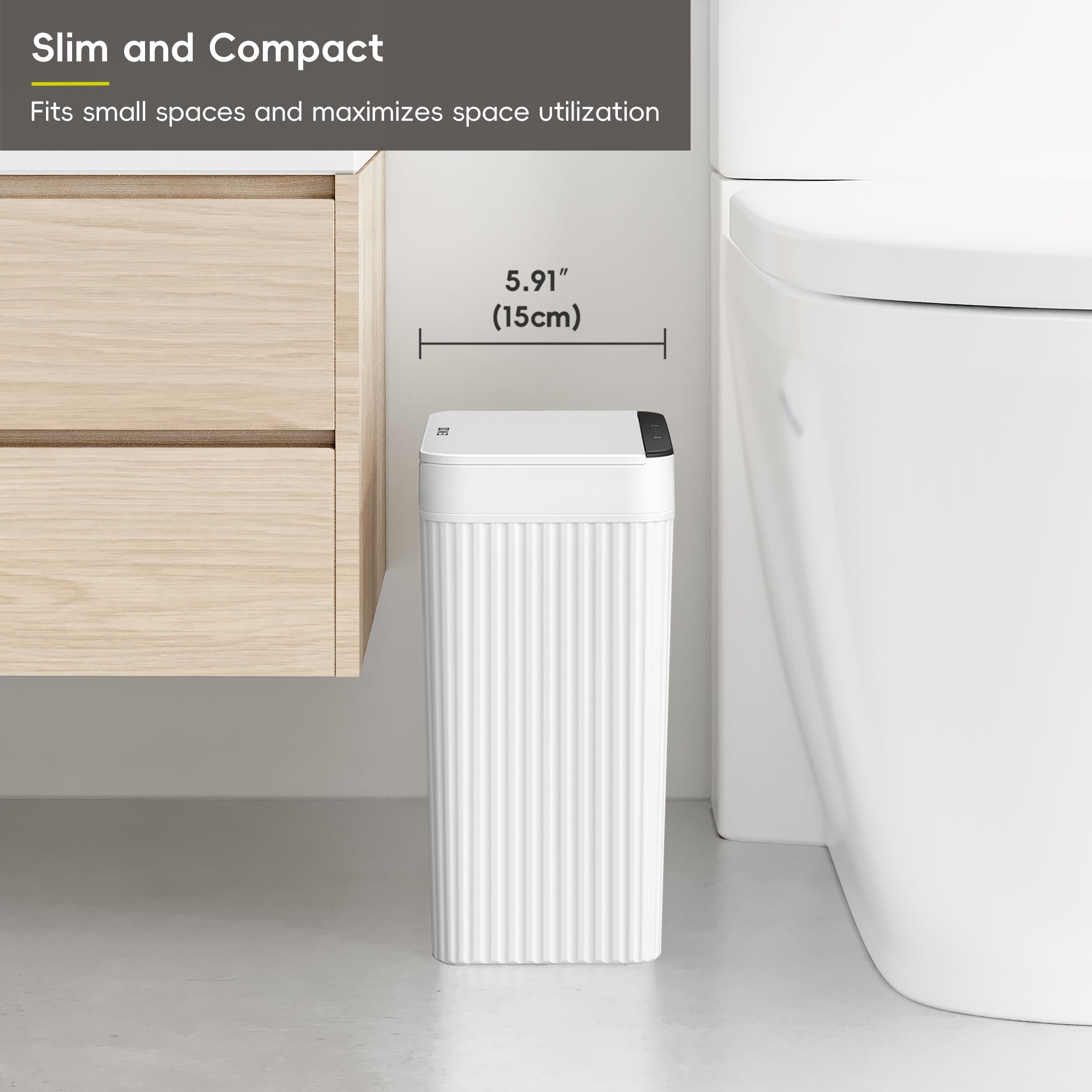 Slim and Space-Saving – Just 5.91 inches wide, this slim trash can fits tight spaces in bathrooms, bedrooms, and more. Compact on the outside yet spacious inside, it’s an ideal small garbage bin for limited areas