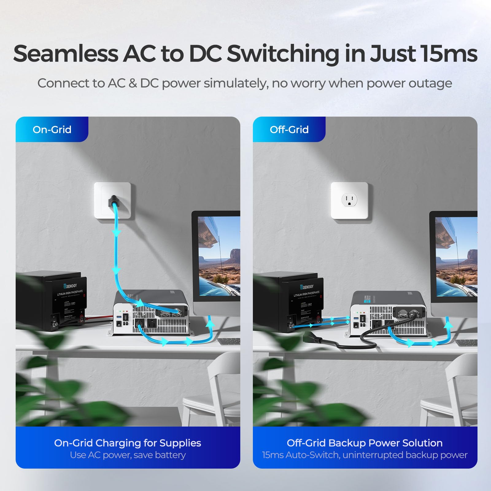 【Inverter with Auto Transfer Switch】If your Renogy inverter is connected to the mains, the inverter will automatically use the mains to power your electrical appliances. When your shore power connection is disconnected, it will automatically use the backup power in the system to power your appliances, ensuring uninterrupted operation and worry-free energy.