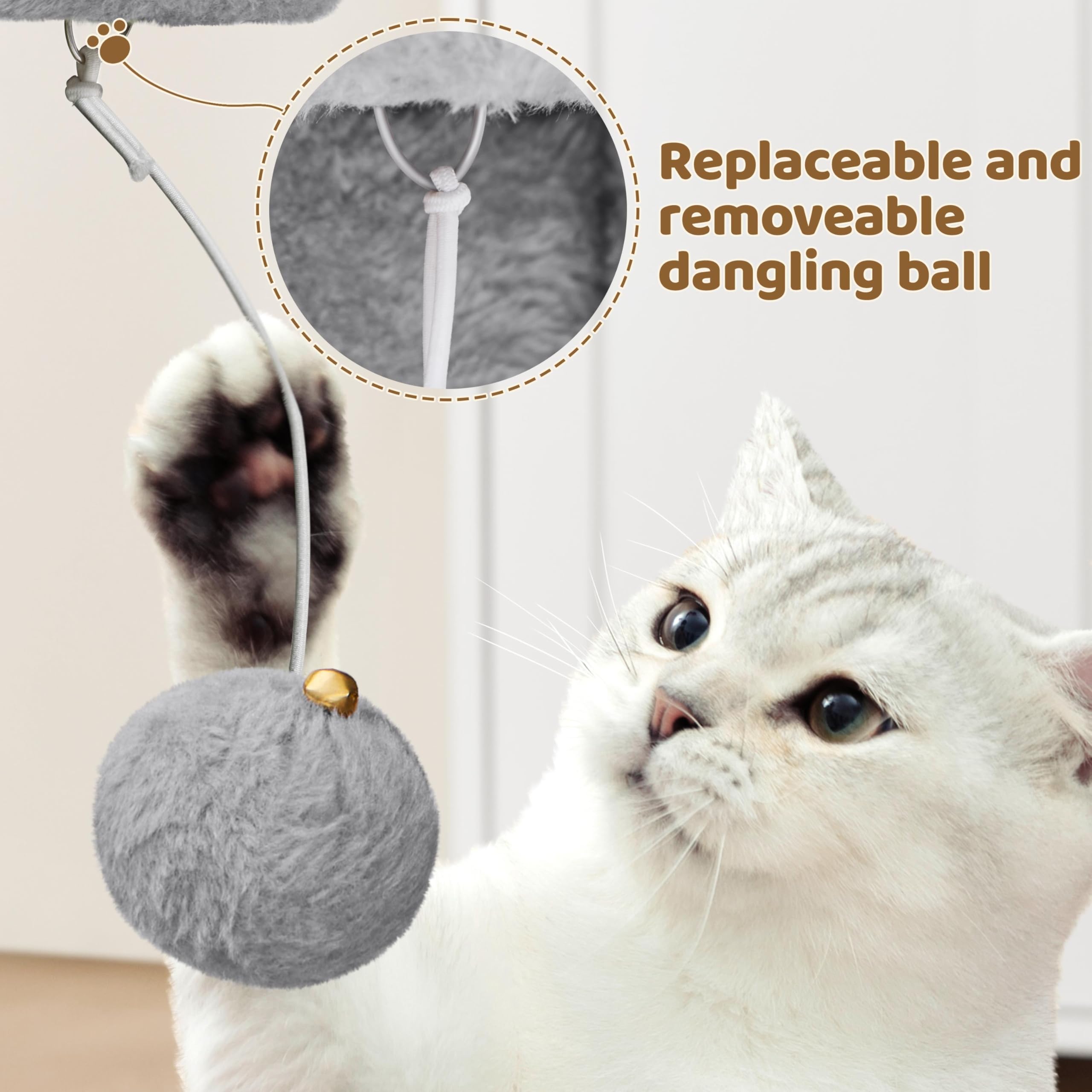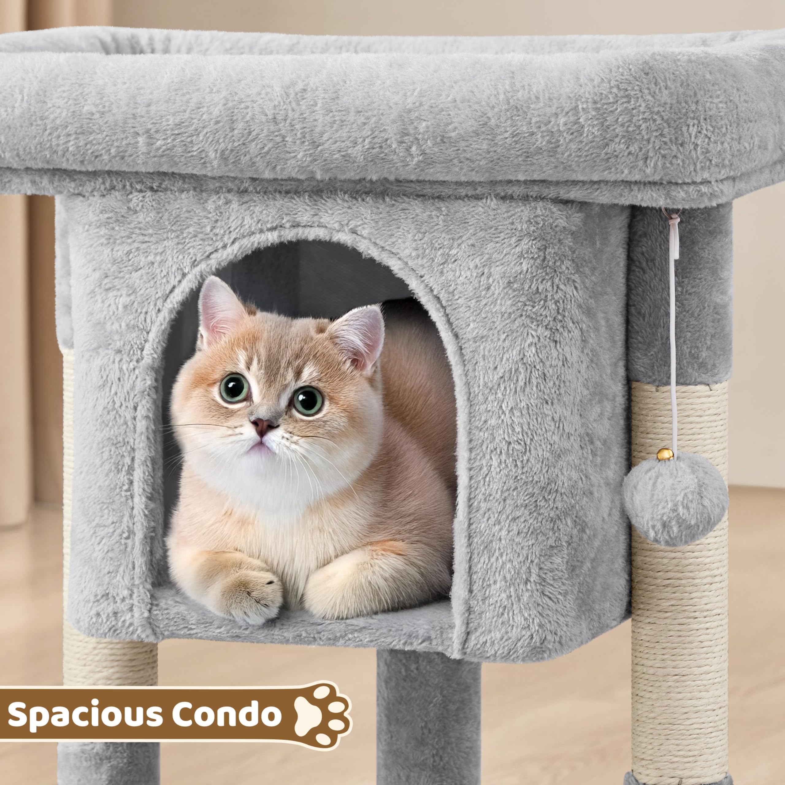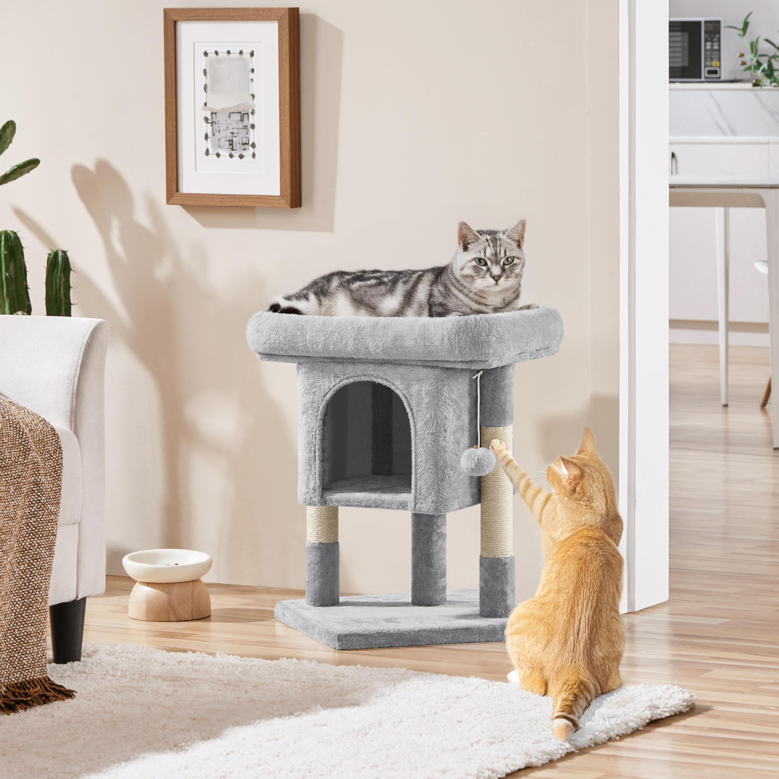 Have Lots of Fun: The square condo of this cat tree is built close to the ground, so kittens can effortlessly get into their sleeping bed. The tall sisal-wrapped scratch posts allow cats to file their nails as needed. The dangling ball with a small bell is easy to play with and encourages cats to play together