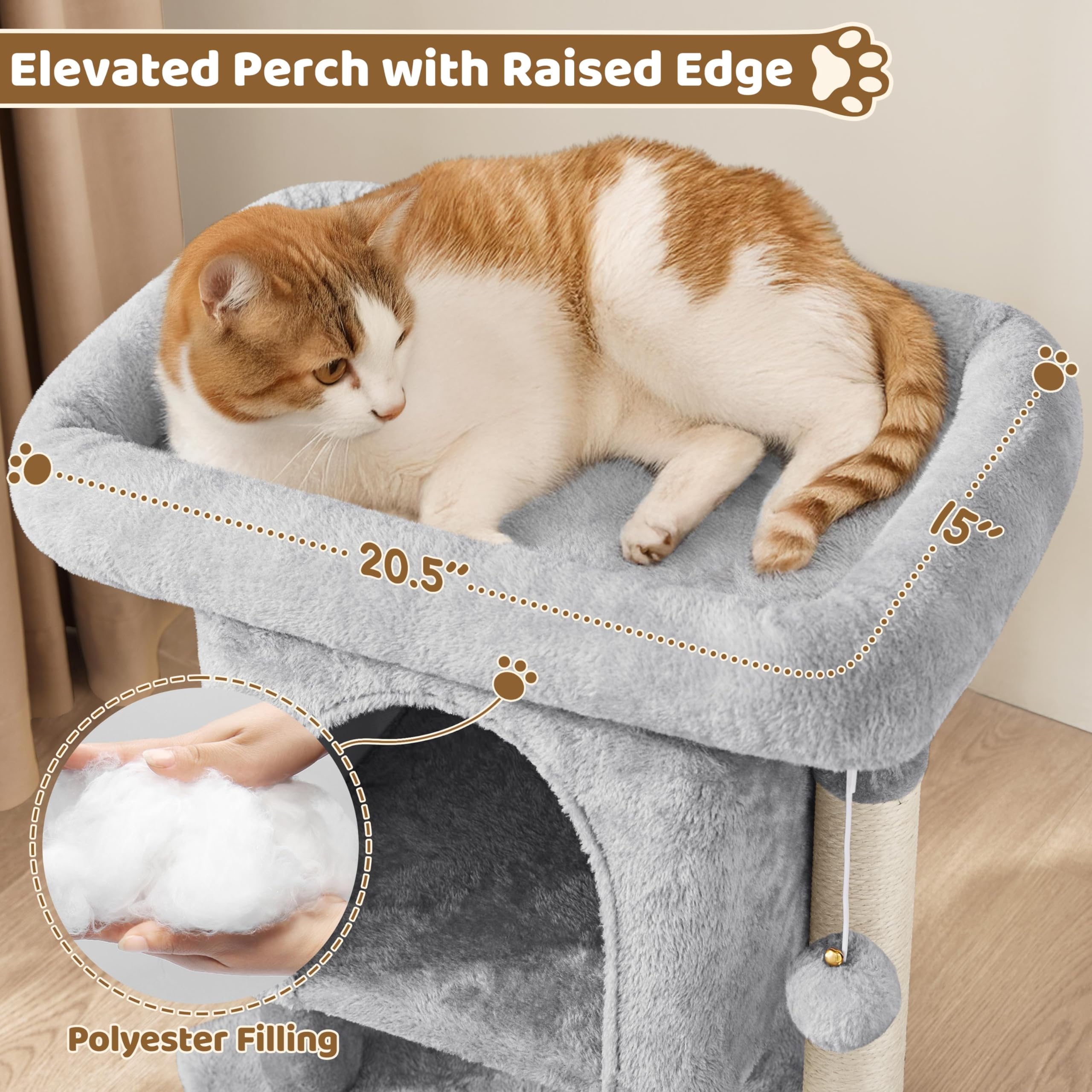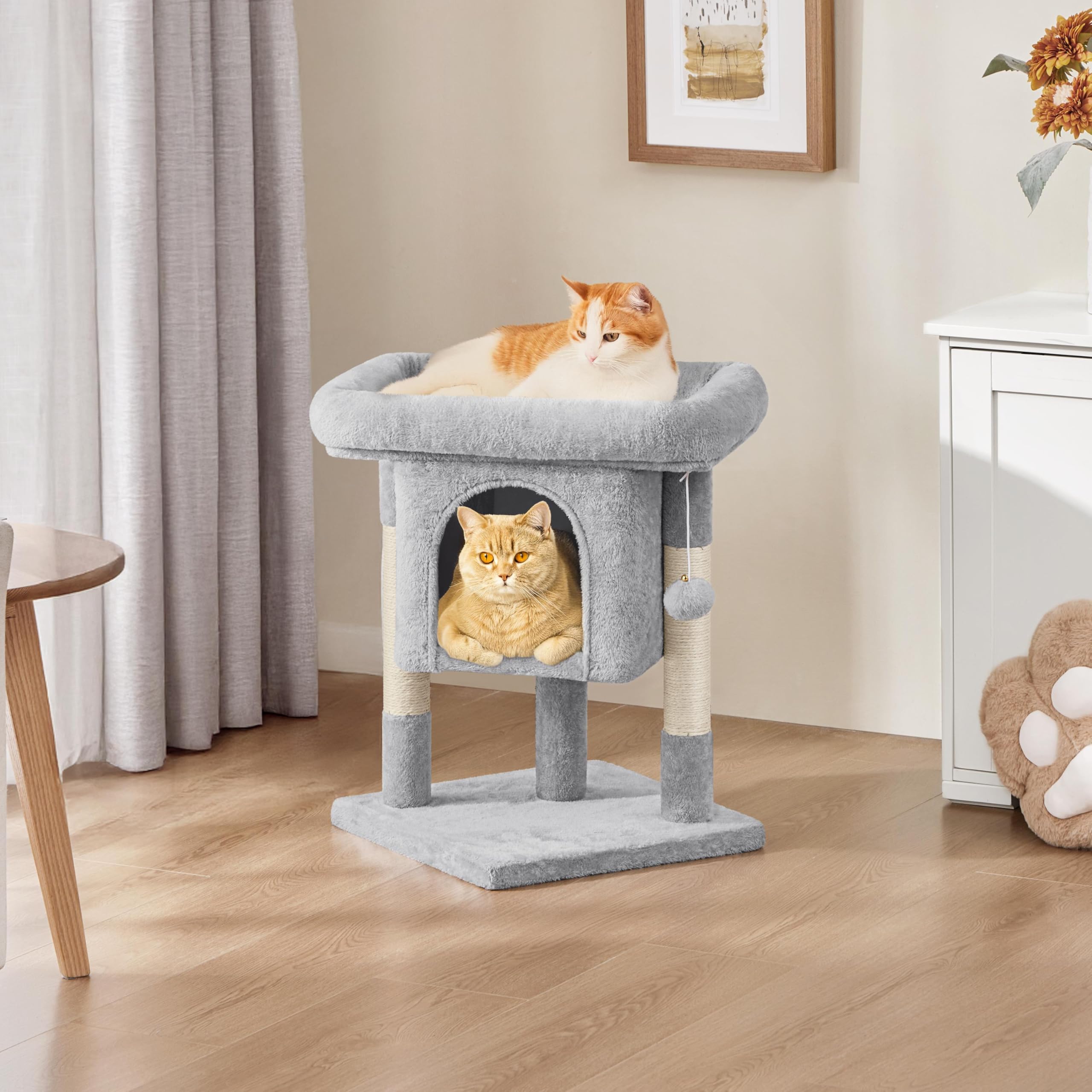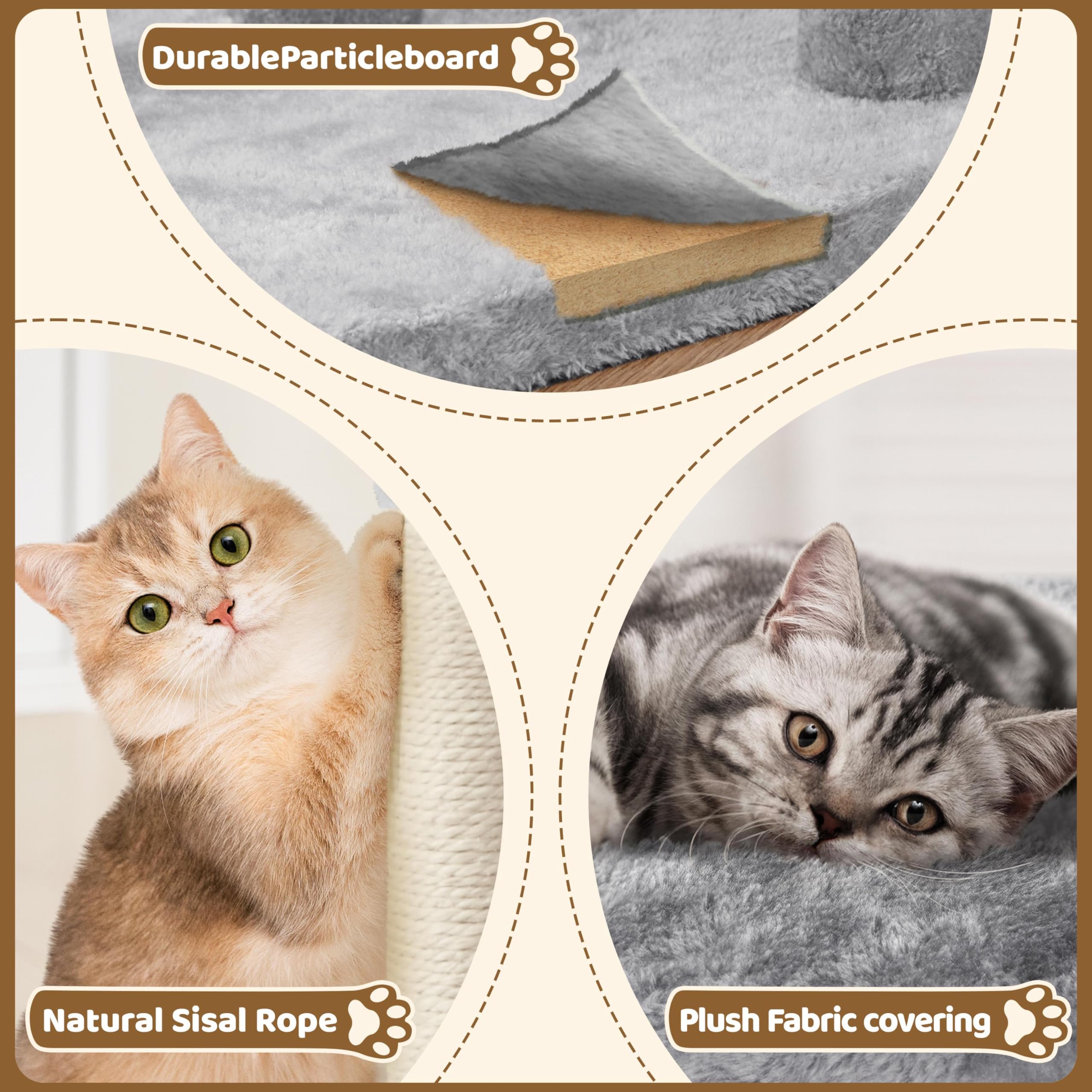 Have Lots of Fun: The square condo of this cat tree is built close to the ground, so kittens can effortlessly get into their sleeping bed. The tall sisal-wrapped scratch posts allow cats to file their nails as needed. The dangling ball with a small bell is easy to play with and encourages cats to play together