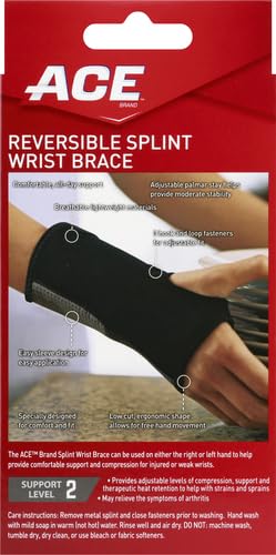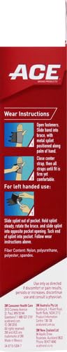 Product Description ACE Brand Reversible Wrist Brace has a palm stabilizer that helps provide moderate stability for weak, sore or injured wrists. Designed with three straps, this wrist brace helps you achieve your desired amount of support, and the palmar splint adjusts for customizable support. The ergonomic design of this ACE Brand wrist brace lets you retain full mobility in your fingers. Made of soft and breathable material, this wrist stabilizer helps keep your skin cool and dry. You can wear this wrist support on either your left wrist or right wrist. Make sure to measure around the smallest part of the wrist. The fit range is from 5.5' to 8.5" with a moderate level of support. For everyday comfort and wrist support, reach for the ACE Brand Reversible Wrist Brace. Trusted since 1918, ACE Brand guarantees its wrist supports to be of the highest quality. ACE Brand products are supported by our expert panel of engineers and medical professionals. With ACE Brand, you can keep moving forward. Manufacturer Contact Information 3M