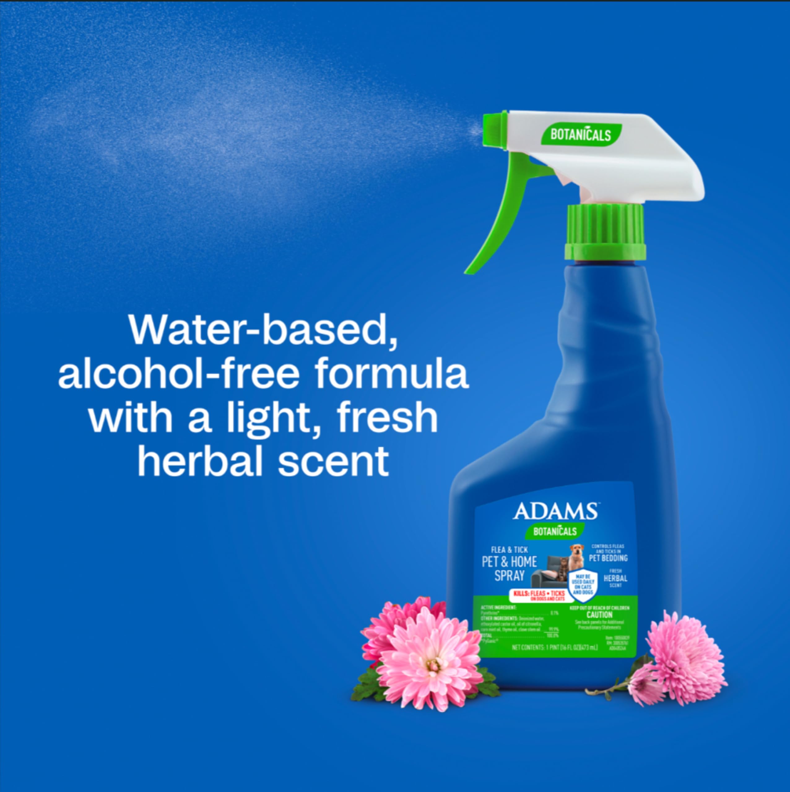 Help care for your dog, cat and home with ADAMS Botanicals Flea & Tick Pet & Home Spray. This treatment is formulated with botanicals and essential oils that target fleas and ticks. This product is water-based, alcohol-free and offers a fresh herbal scent that’s light and non-greasy for gentle care. It is a versatile, multi-purpose spray approved by the EPA Reg. # 270-304-89459 that can be used daily by spraying directly on your pet or home surface. The best protection you can offer your pet is protecting them and the areas where they live and play. Since only 5% of fleas live on your pet, use this spray with other ADAMS products to protect your pet, home and yard for complete pest control. Since 1975, the people who bring you ADAMS has helped owners confidently care for their pets, ensuring they live happy and healthy lives.