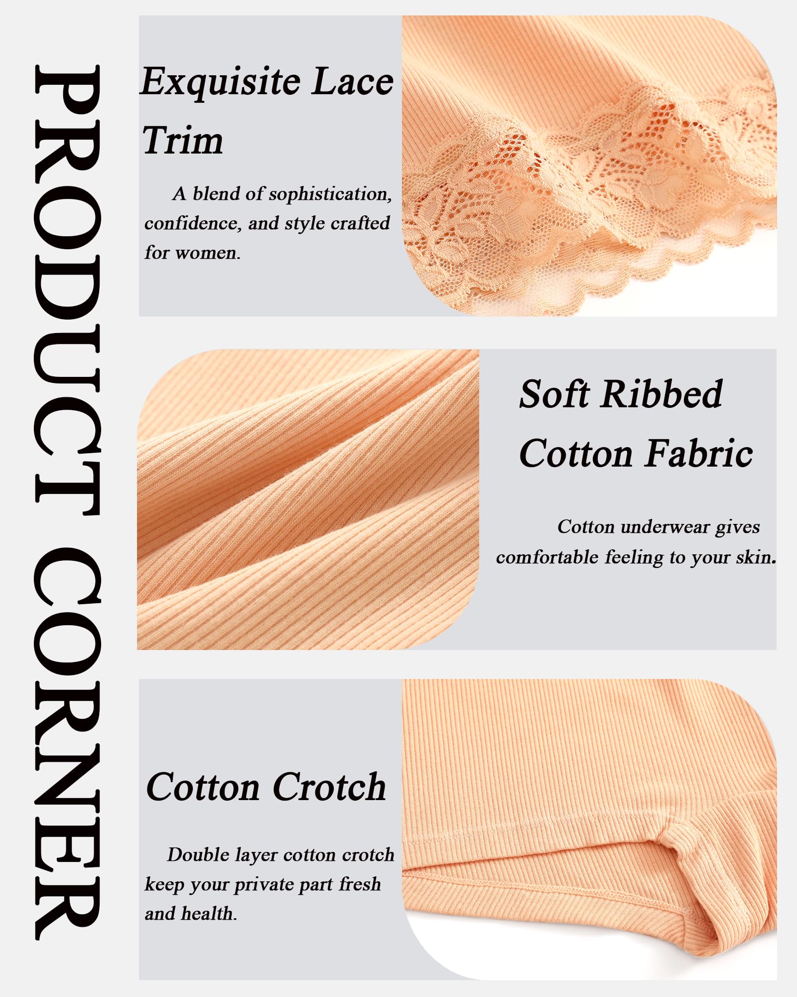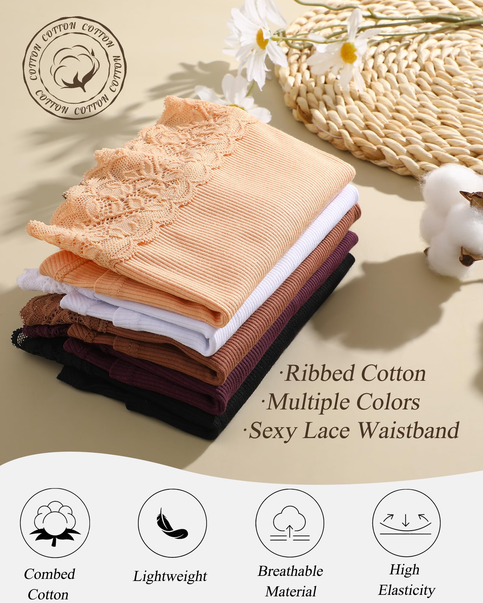 Cotton underwear for women : Our womens underwear are crafted from 95% cotton and 5% elastane, ensuring a perfect blend of softness and stretch for all-day comfort. The RIBBED TEXTURE contours curves smoothly, ensuring a breathable snug fit that stays fresh and flattering all day.