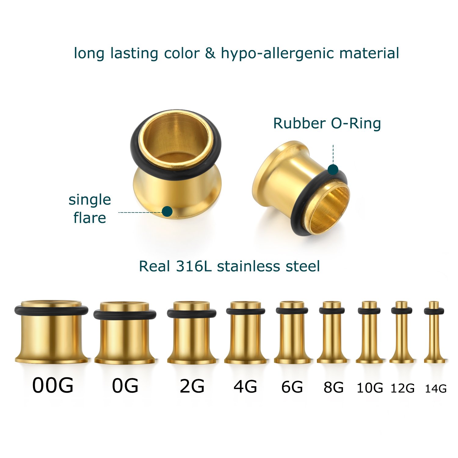 Sizes: 14G/1.6mm, 12G/2mm, 10G/2.4mm, 8G/3.2mm, 6G/4mm, 4G/5mm, 2G/6mm, 0G/8mm, 00G/10mm - 2 pcs of each size