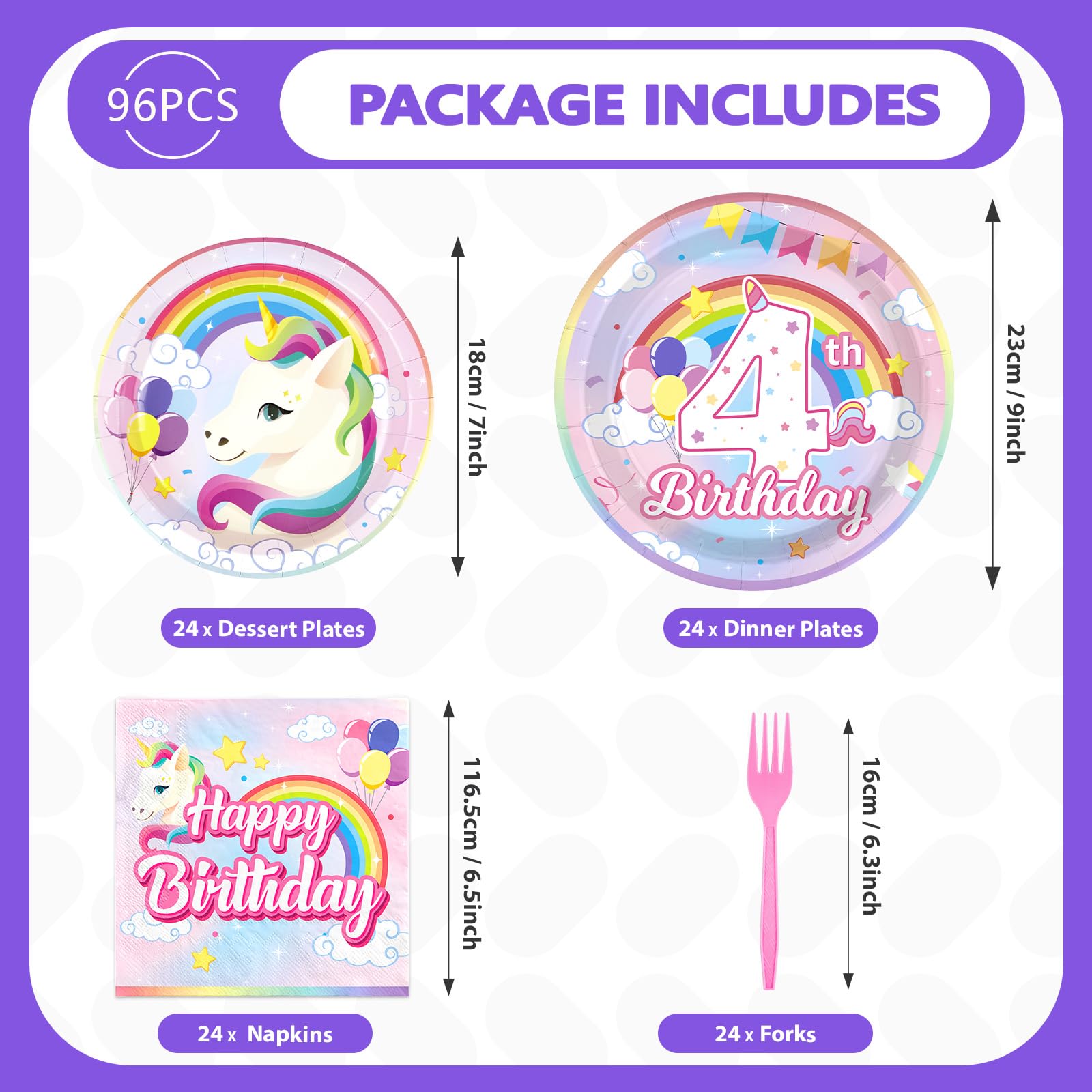 Unicorn Party Supplies: Transform your 4th birthday party into a fantasy wonderland with our 96 pcs unicorn tableware set! You'll get 24 9" unicorn dinner plates, 24 7" unicorn dessert plates, 24 napkins and 24 forks to add a touch of magic and whimsy to your celebration