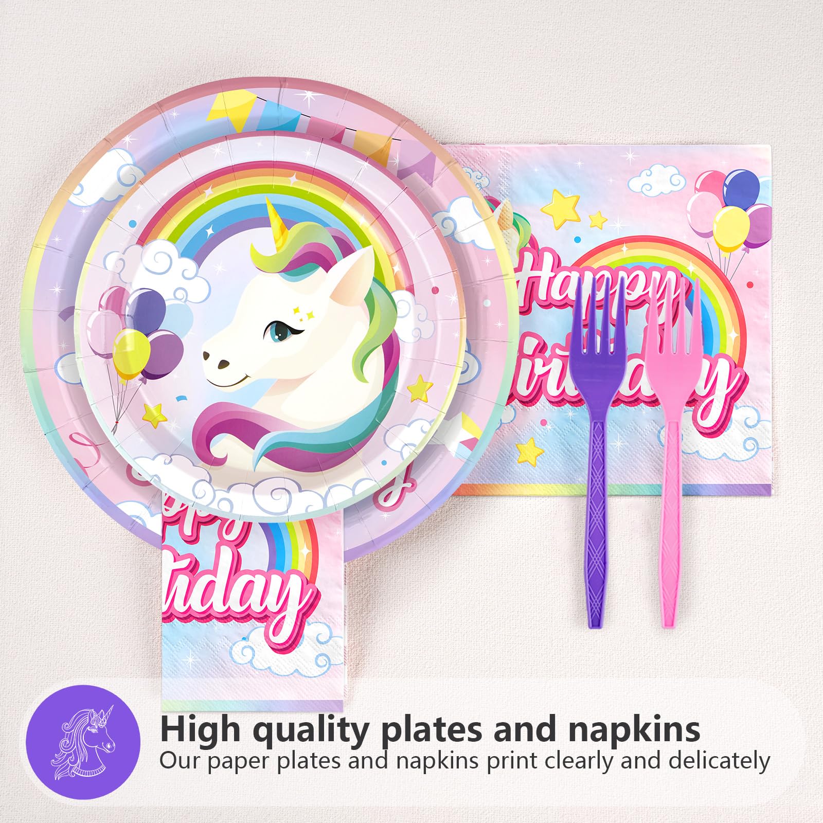 Upgraded Material: Our Unicorn 4th Birthday Plates is made of premium thick paper, upgraded 350g is more sturdy and not easy to bend. The napkin is 3 ply, soft and absorbent, not easy to tear. The fork is not easy to break. Rainbow unicorn pattern is beautifully printed and will not fade. High quality materials ensure you enjoy the party smoothly and worry-free! (Tip: Please do not microwave the plates.)