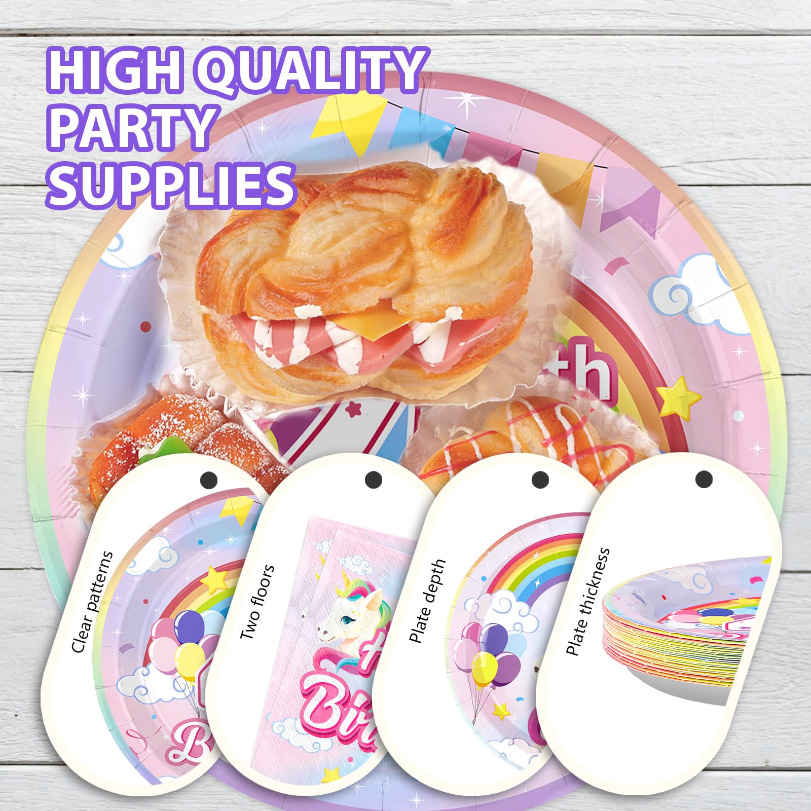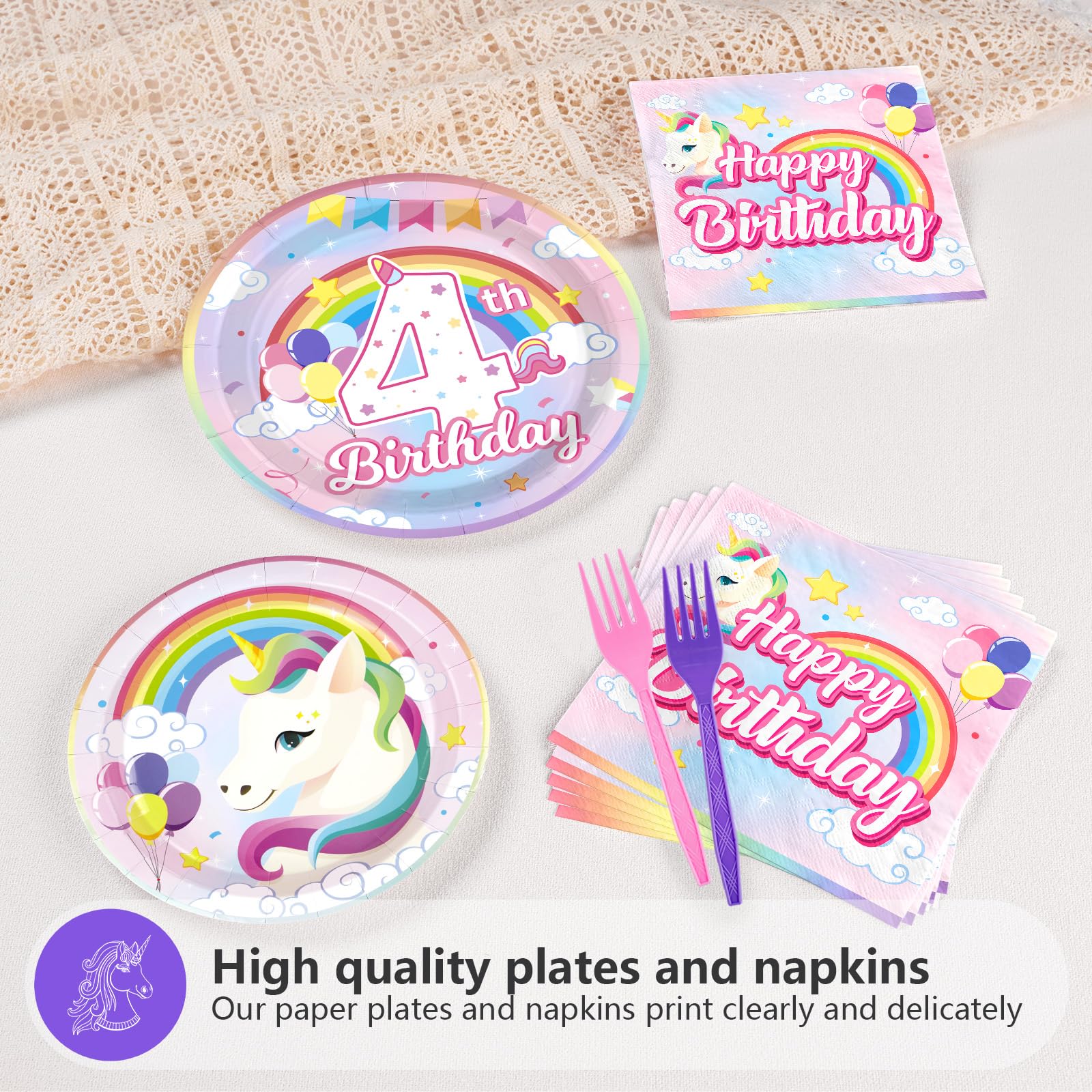Fantasy Design: The unicorn plates and napkins with rainbow unicorn design, with rainbow gradient color sky as the background, dreamy and unique, balloons, flags, clouds, stars and other elements add colorful, make your 4th birthday party really special, and create a rainbow of wonderful memories for you and your friends and relatives
