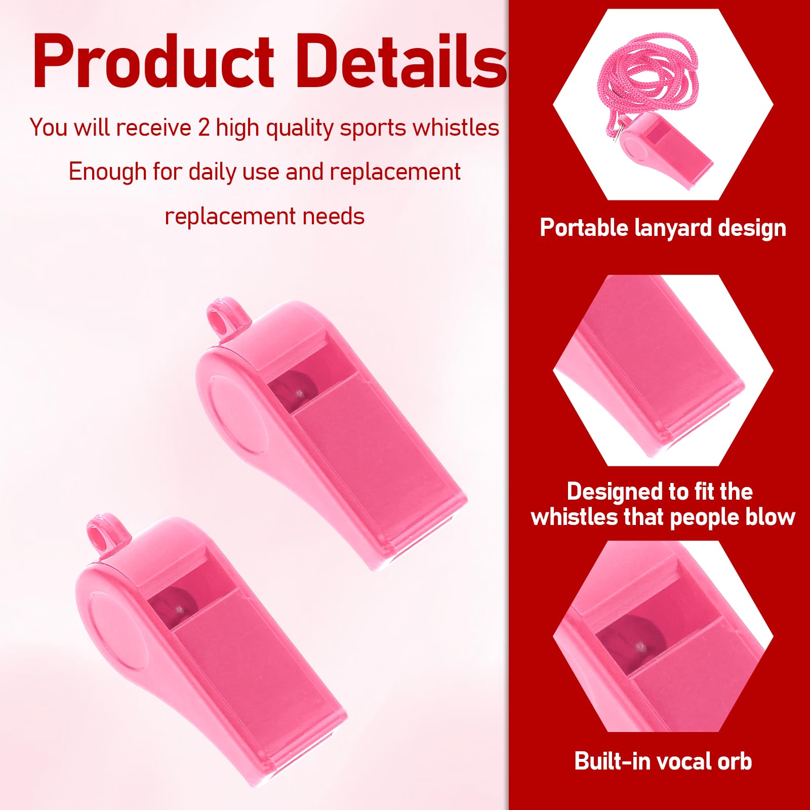【Package Include】You will receive 2 pcs pink plastic whistles with lanyards. Made of extra tough ABS plastic and will last for years. The ABS plastic is environmental & non-toxic, we take your health seriously.
