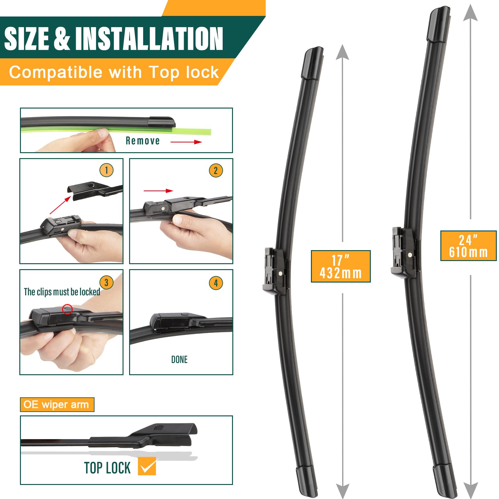 【TOOL-FREE 2-MINUTE INSTALLATION】True "Plug & Play" design. Simply align the dedicated slot with your wiper arm and push until you hear a "click" lock. No tools or modifications required. Comes with a step-by-step installation manual inside the package for quick, frustration-free setup.