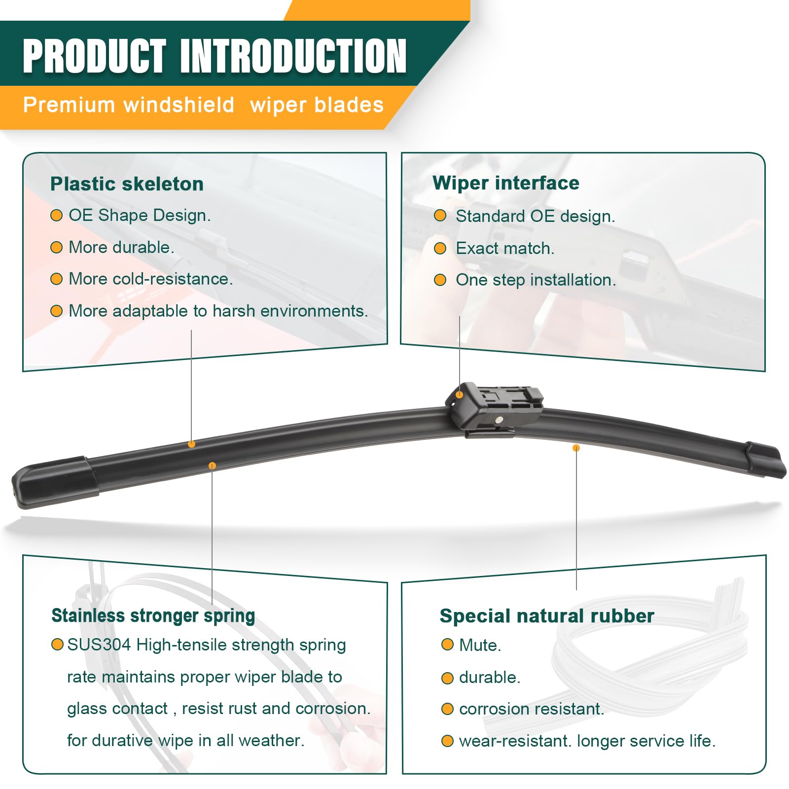 【GRAPHITE + MICRO-PTFE COATING】Grade 5A natural rubber with proprietary cross-linked Graphite and Teflon (PTFE) coating. Reduces friction by 60% to prevent squeaking or chatter. Ensures a crystal-clear wipe even on treated windshields or in heavy downpours for maximum safety.