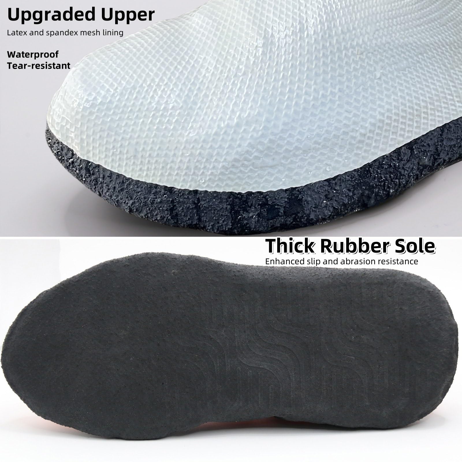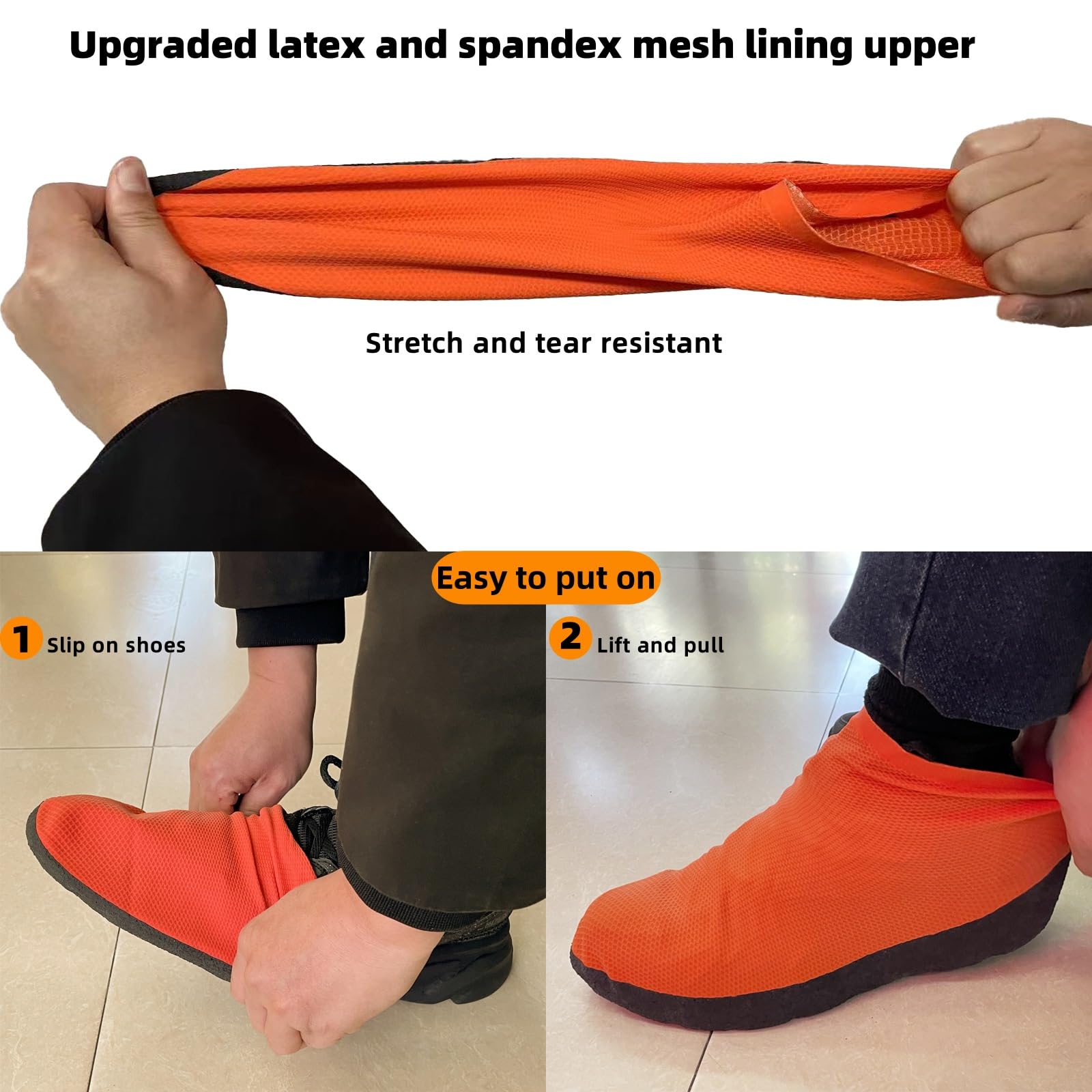 Easy to put on: The upper of this rain shoe cover is made of natural latex and spandex mesh lining,which is waterproof and at the same time has better stretch and tear resistance,can withstand multiple uses