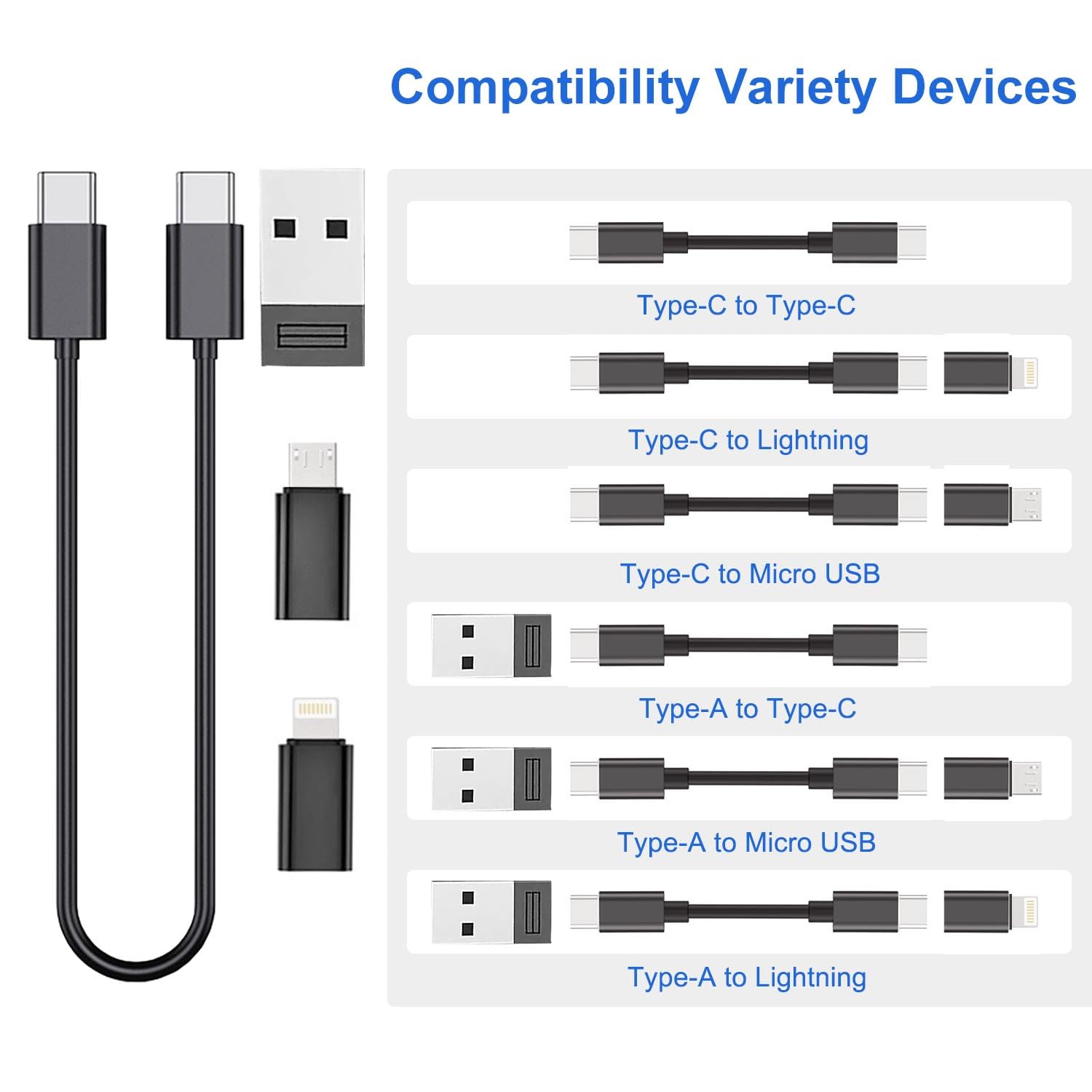 【Fast Charging and Data Transfer】The USB C to USB-C charging of this travel charging kit is supported up to 60W (20V 3A, If the charger adapter is supported), and the USB OTG data adapter transfer speed is up to 480Mbps. Also the USB C to micro USB: 18W, USB A to micro USB: 18W, USB A to USB C: 18W, USB C to iPhone: 20W, and USB A to iPhone: 12W.