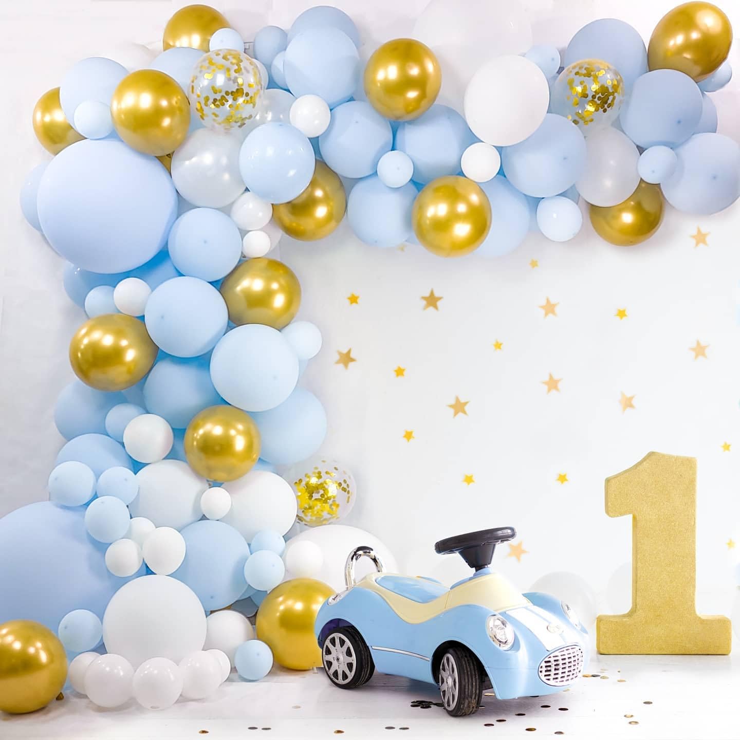 ★100 PCS BALLOON ARCH KIT★: Blue and gold balloon arch kit includes 37 pcs blue balloons(10 pcs 12",10 pcs 10", 15 pcs 5", 2 pcs 18" ), 37 pcs white balloons(10 pcs 12",10 pcs 10", 15 pcs 5", 2 pcs 18" ), 18 pcs metallic gold balloons, 8 pcs gold confetti latex balloons, 1 roll of 16ft arch balloon strip tape and 1 roll of 100 points stickers.