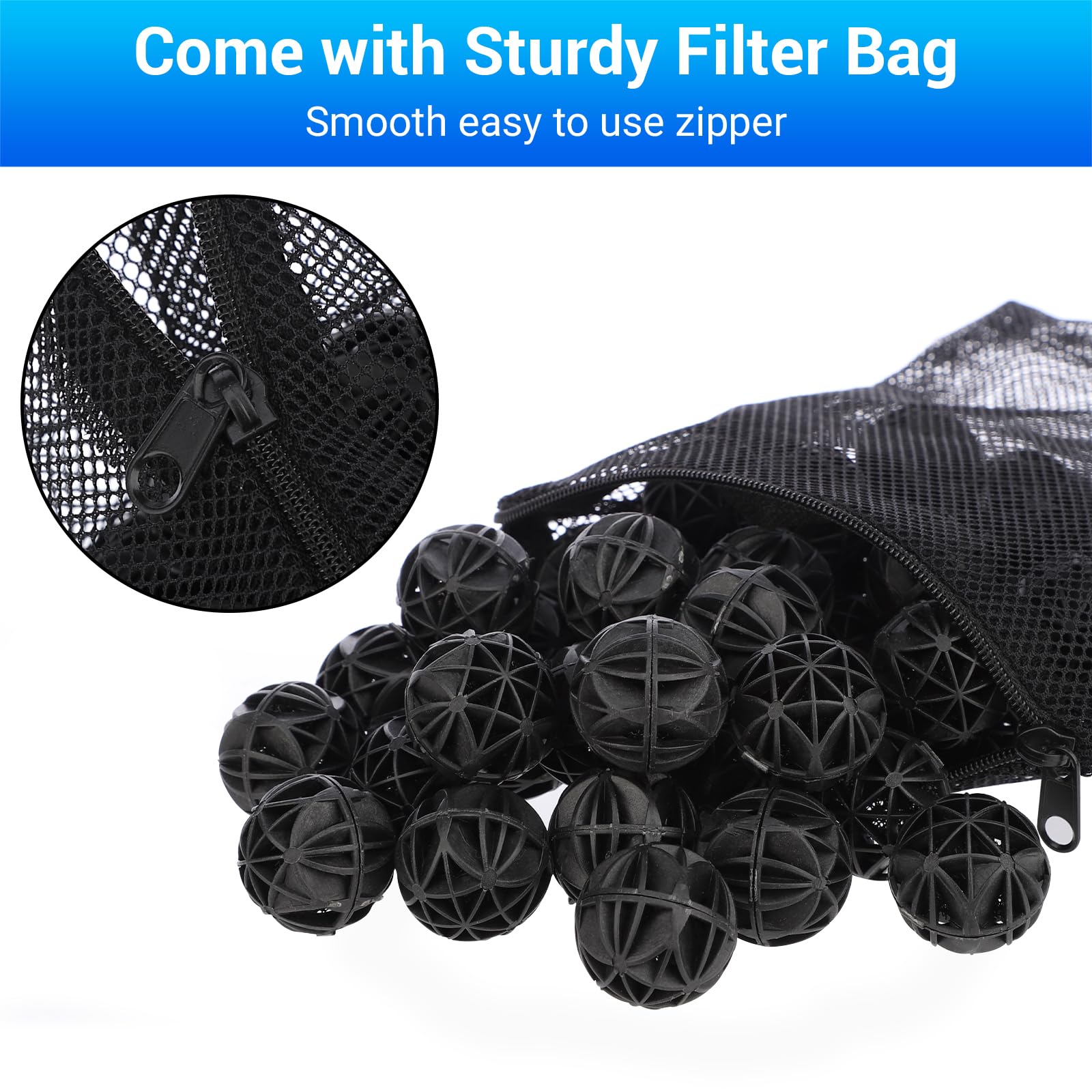 COME WITH DURABLE MESH BAG: Package included 50 pack 1" bio balls and a sturdy mesh bag with zipper. If you use our bio ball in a typical pond, remember to add a stone in the bag or put it on the bag to prevent the whole from floating. With our bio balls, you can enjoy a beautiful and clear aquatic environment without the hassle of constantly cleaning your filter system.