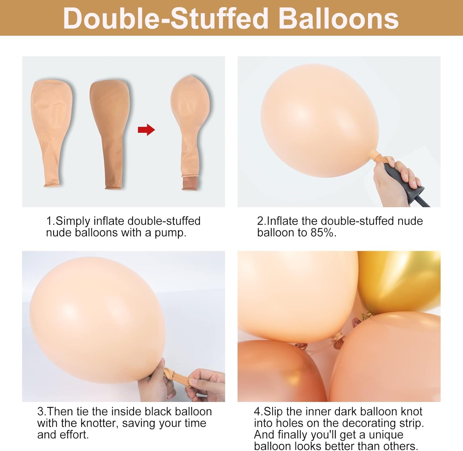 DIY Pink Balloon Garland: Simply inflate double-stuffed nude balloons with a balloon inflator, slip the inner dark balloon knot into holes on the decorating strip and then you'll get a unique balloon looks better than others; We advise inflate blush pink balloons to random sizes; You can make full use of your creativity to combine dusty rose blush balloons of different colors and sizes and connect with glue points and balloon arch strip to achieve amazing effect you want in a complete shape