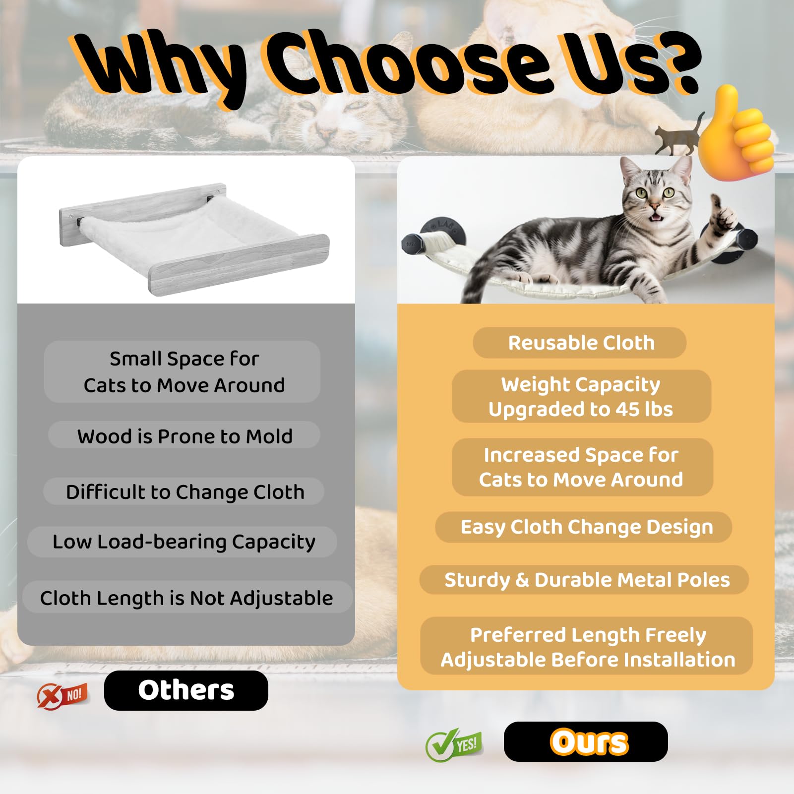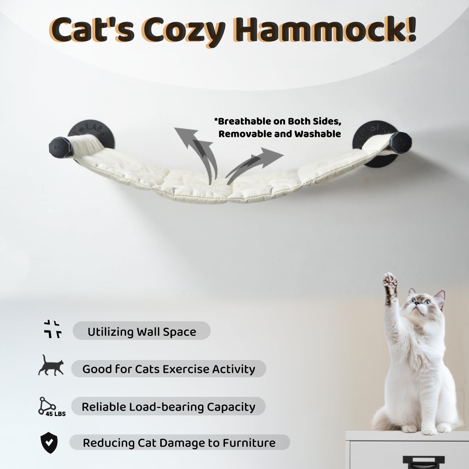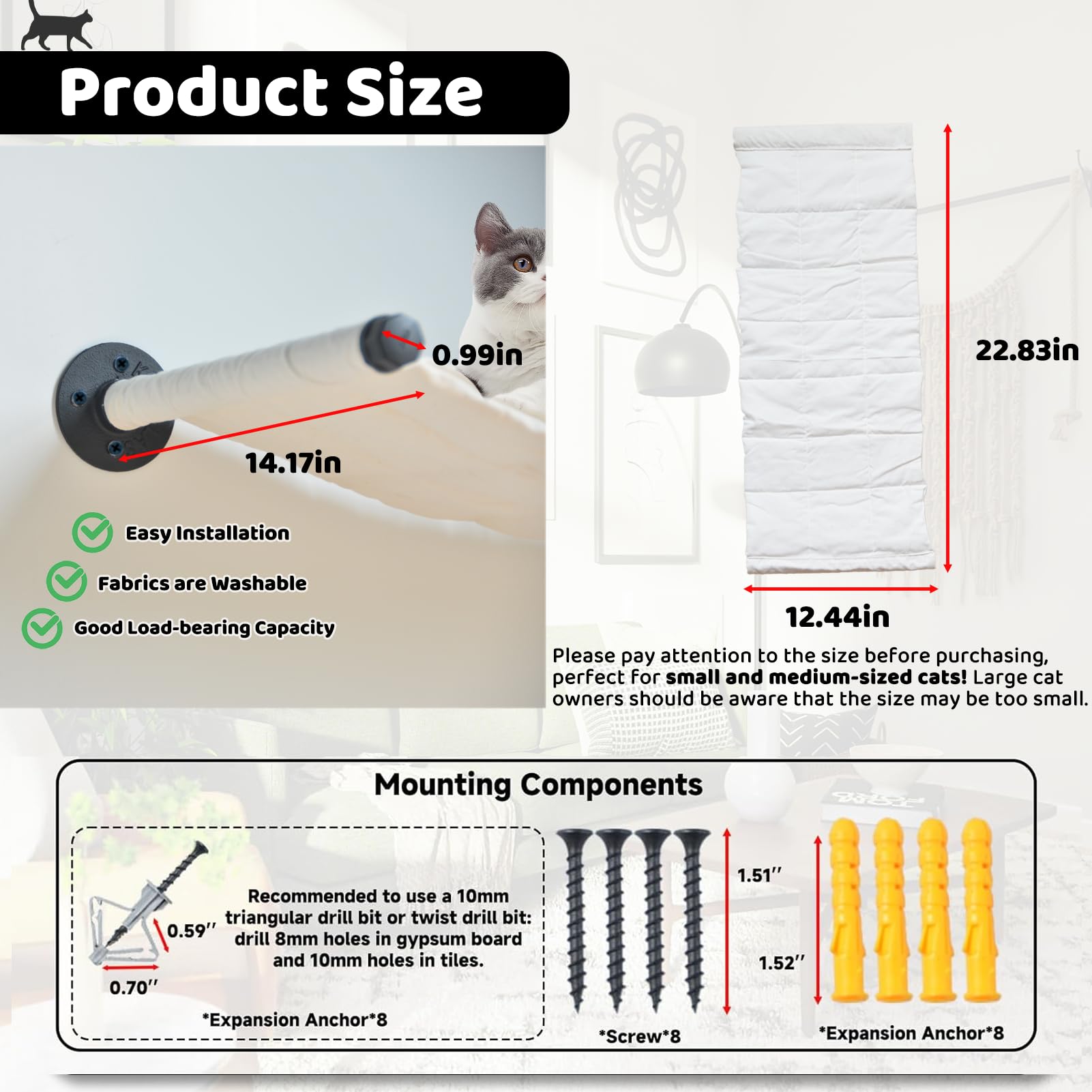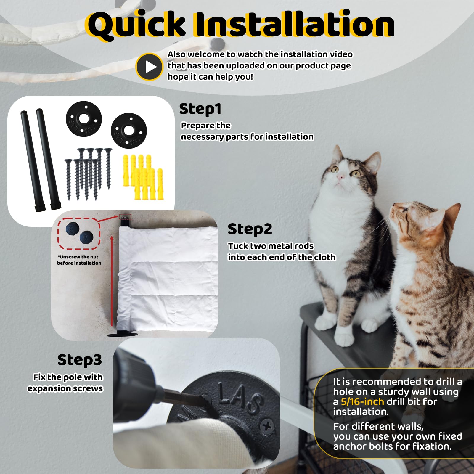 Solid and Sturdy Cat Climbing Shelves: Our solid cat wall frame is made with sturdy and durable metal brackets for added safety and stability of your cat bed. The cat hammock can hold up to 45 pounds, Cats can rest comfortably and safely in the hammock