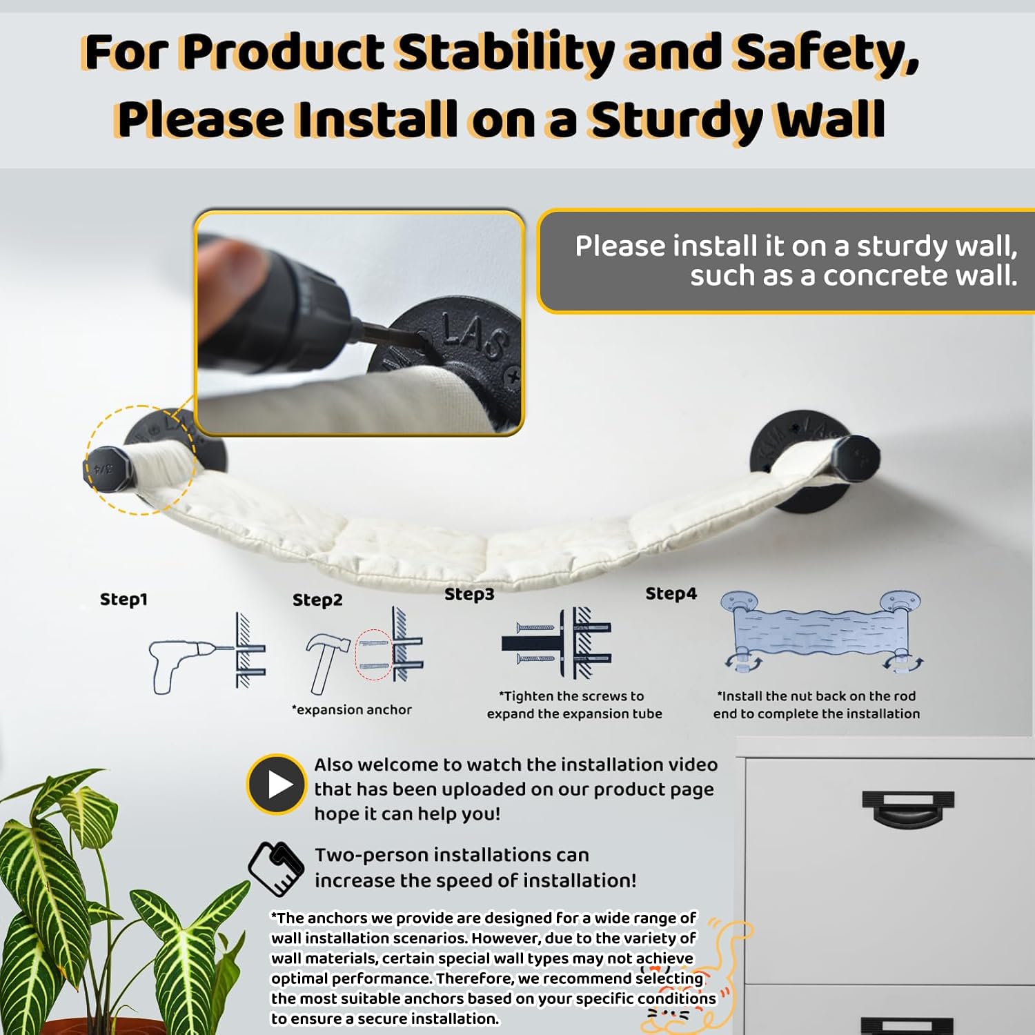 Quick Installation: Only 8 screws are required to securely fasten the wall mounted cat rack. The yellow expansion anchors are designed for solid concrete walls only. If installing on non-load-bearing decorative walls, you will need to provide appropriate mounting hardware yourself